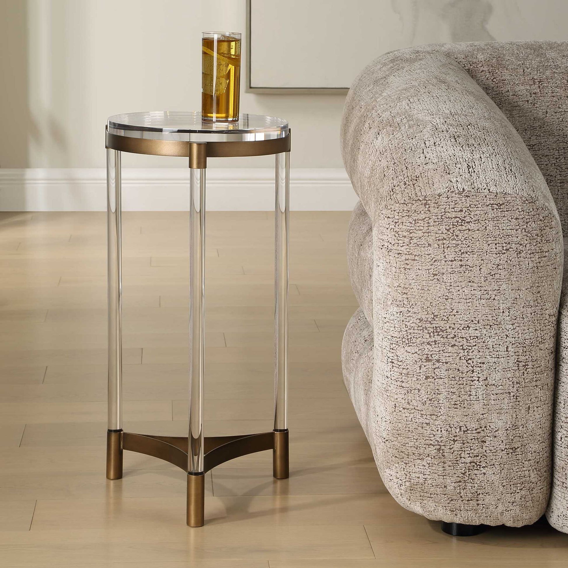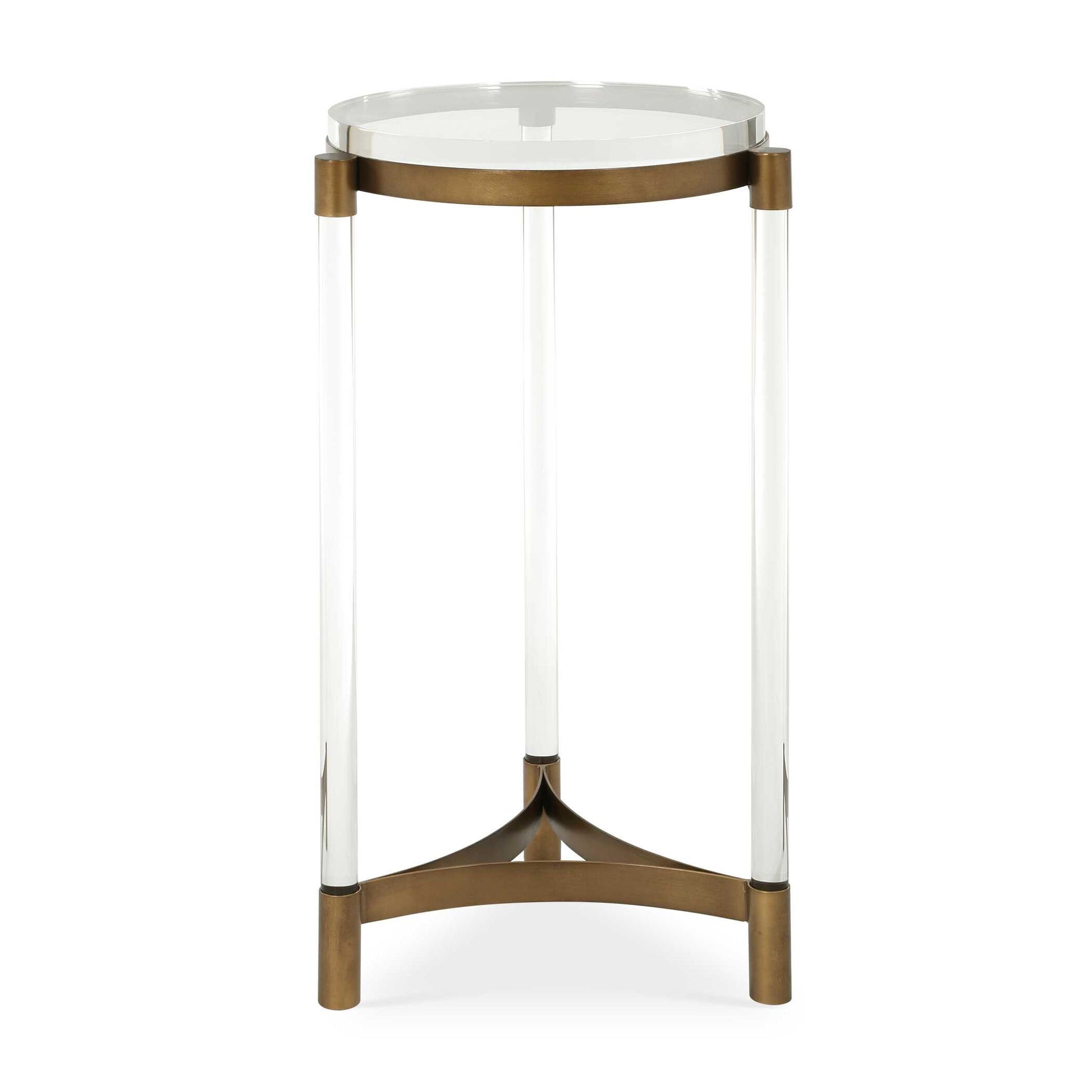 This Stylish Accent Table Features A Bronze-finished Iron Frame, Complemented By Three Clear Acrylic Legs And A Coordinating Top.