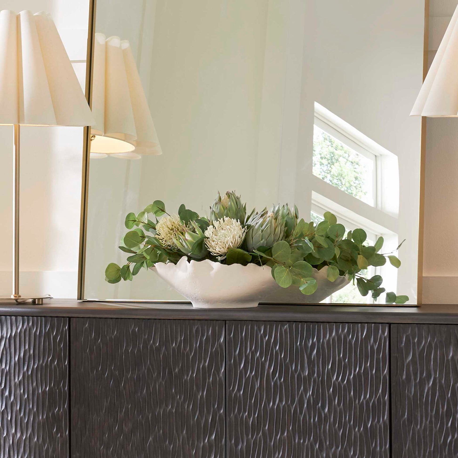 Bring Natural Artistry To Your Space With This Striking Botanical Centerpiece. Featuring Sculptural White Protea Blooms Surrounded By Lush Eucalyptus Stems. Nestled In A Sculpted Off-white Ceramic Bowl With Textural Details And Delicate, Organically Shaped Imperfect Edges That Give The Look Of Flower Petals.