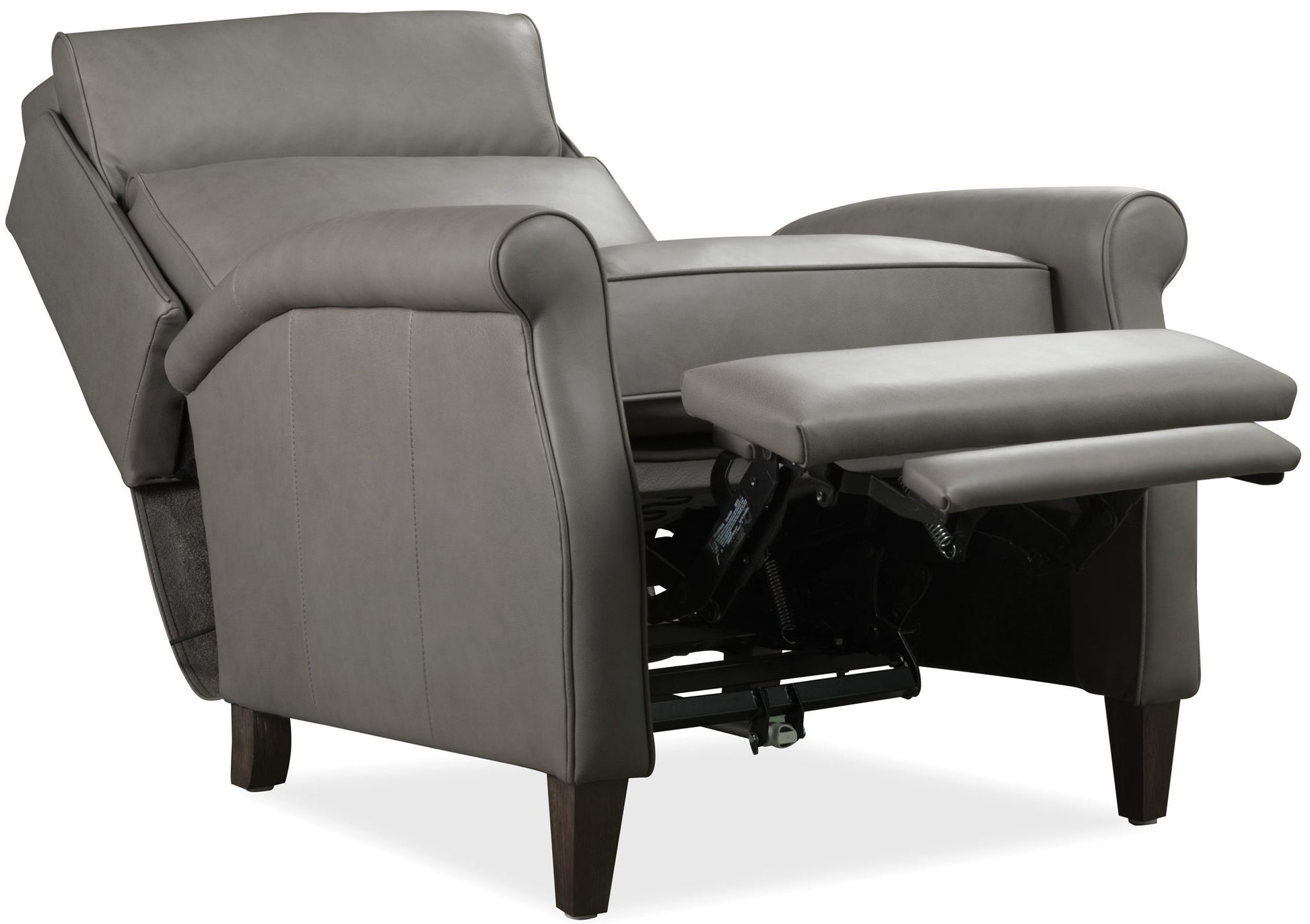 The Randall Recliner in leather offers classic elegance with modern functionality. Featuring power recline, a pop-up headrest, and USB port, this transitional design is anchored by rolled arms and dark wood tapered legs. Its bustle back and rich leather make it a refined yet cozy addition to any traditional or mixed-style interior.
