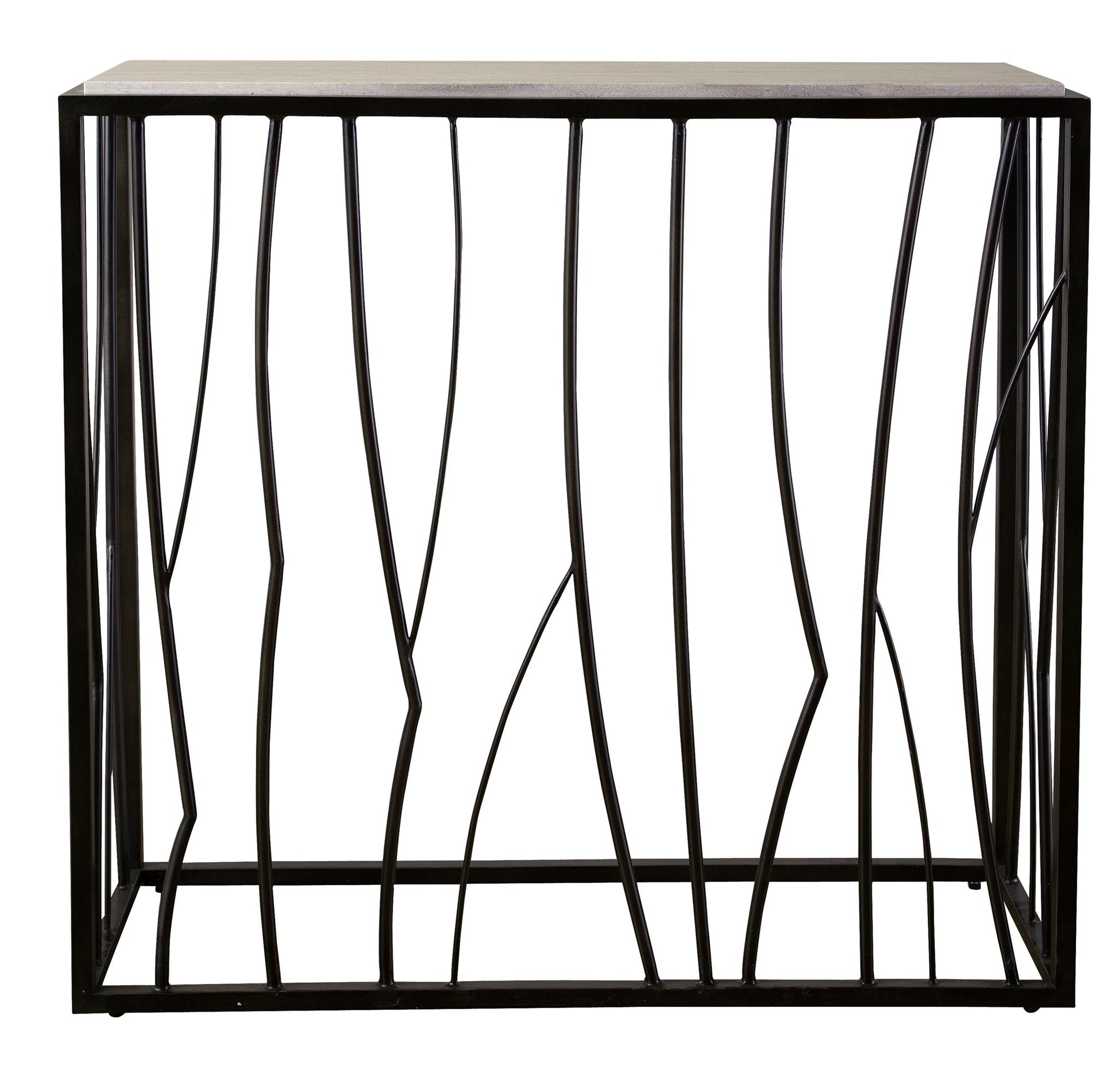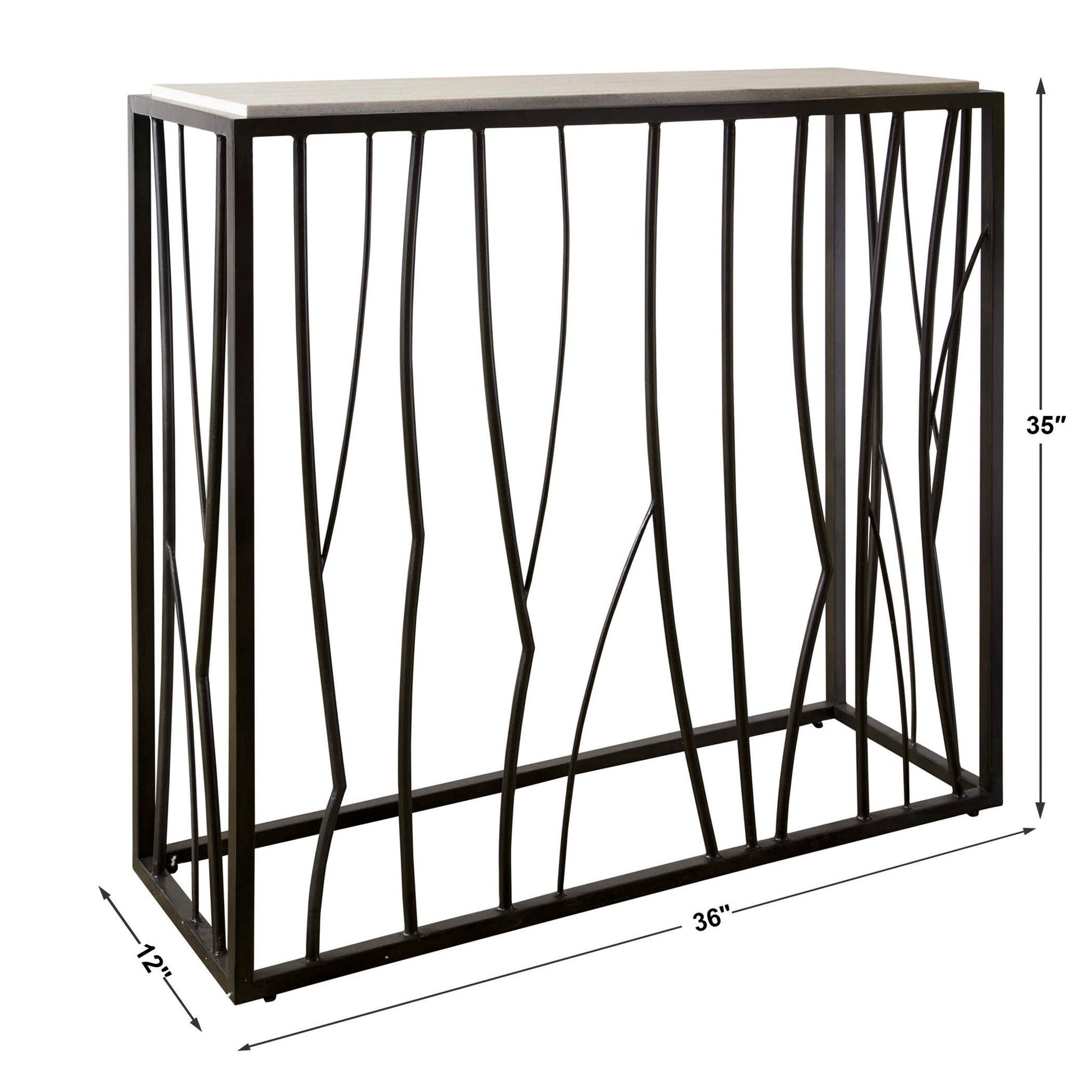 Inspired By Natural Landscapes, This Console Table Features An Asymmetrically Designed Metal Base Finished In Dark Iron Paired With A Natural Ivory Travertine Top. True To The Nature Of Natural Materials, Each Piece Will Have Unique Marbling And Veining Throughout.