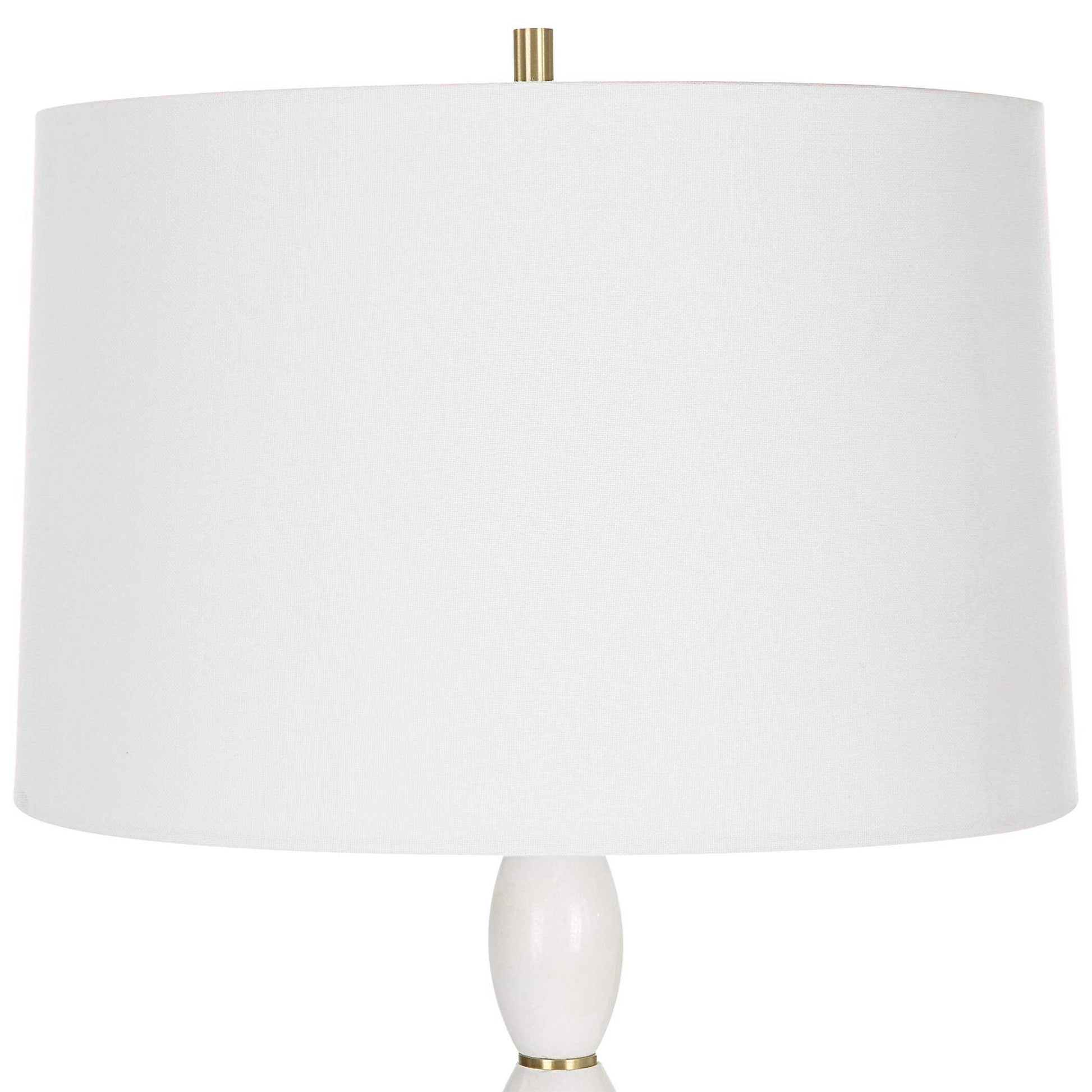 Exuding Timeless Elegance, This Table Lamp Showcases A Beaded White Marble Design Displayed On A Matching White Marble Foot, Accented By Antique Brushed Brass Details. The Lamp Is Complemented By A Slightly Tapered Hardback Shade In White Linen Fabric.