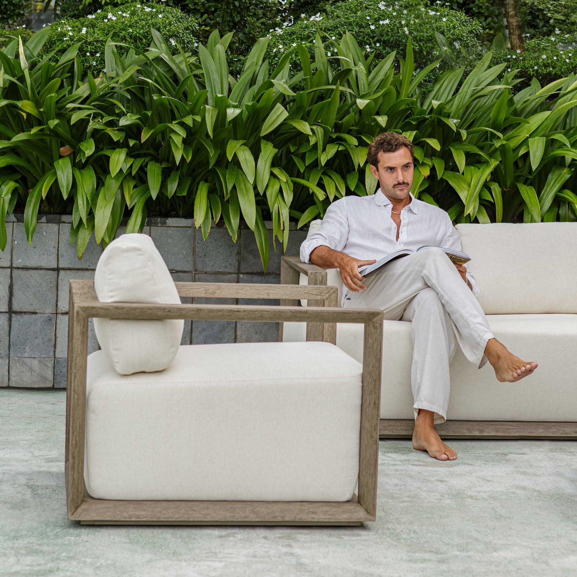 The Remsen Outdoor Lounge Chair Features A Striking Architectural Frame With Smooth Interior Curves That Give A Sculptural Presence. Constructed Of Solid Mahogany Wood In A Weathered Gray Finish With Wire-brushed Details. Its Generously Cushioned Floating Seat, Upholstered In An Oyster White Solution Dyed Acrylic Fabric, Is Designed To Withstand The Moisture And Dirt That Comes With Outdoor Use. Solid Wood Will Continue To Move With Temperature And Humidity Changes, Which Can Result In Cracks And Uneven Surfaces, Adding To Its Authenticity And Character.