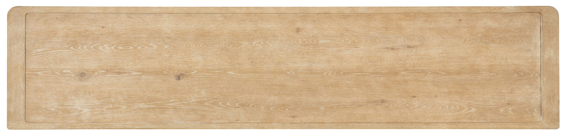 Designed to help you emulate tranquil lake and ocean shore environments in your home, the Retreat Entertainment Credenza features the sand-colored Dune finish, transparent by design to showcase the unique grain patterns of the Oak Veneers. The 4 doors have soft-close hinges and magnetic door catches, with one adjustable shelf behind each pair of doors, a ventilated back panel and a 3-plug electrical outlet located behind the right-side pair of doors. Custom large round pulls in a soft pewter color add a dramatic detail.