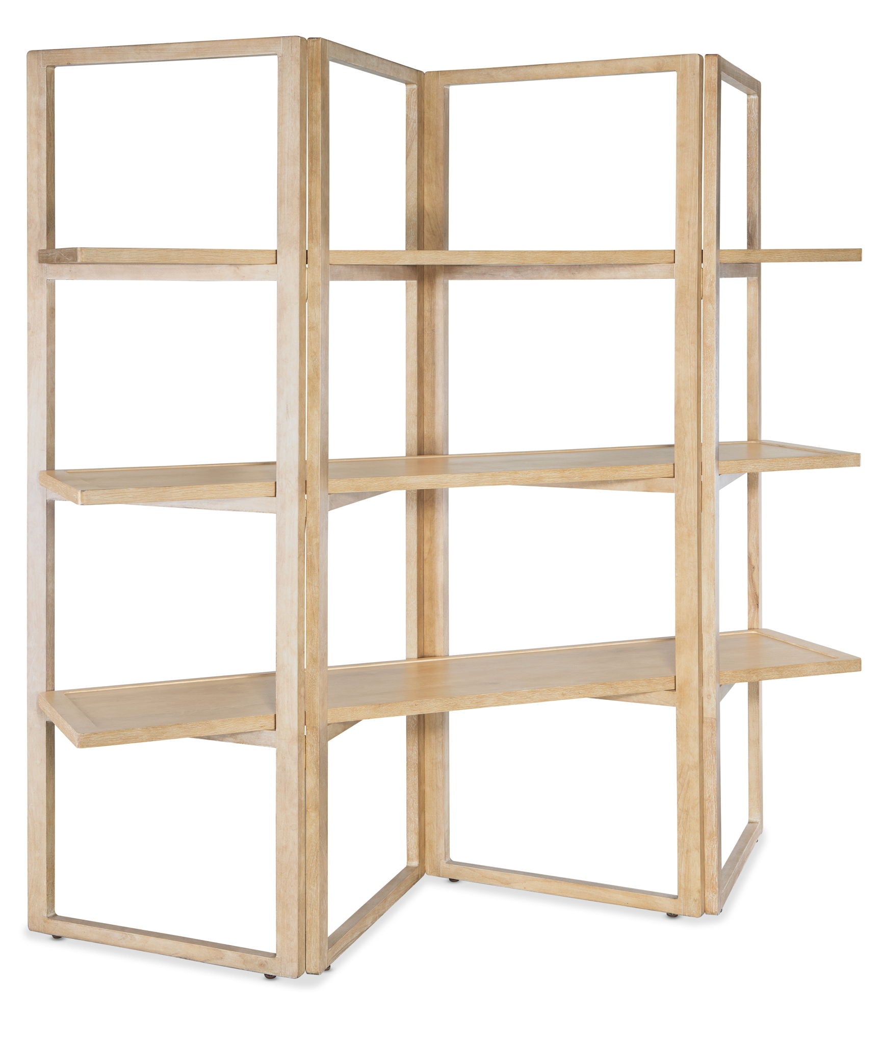 Serene with a modern twist and clean lines, the Retreat Folding Etagere defines and declutters your space. With three fixed shelves, the etagere is finished on all sides and can be used in the center of a room and from either side. It is crafted of Oak Veneers and finished in the sand-colored Dune, transparent by design to reveal the grain patterns of the wood veneer for an organic appeal.