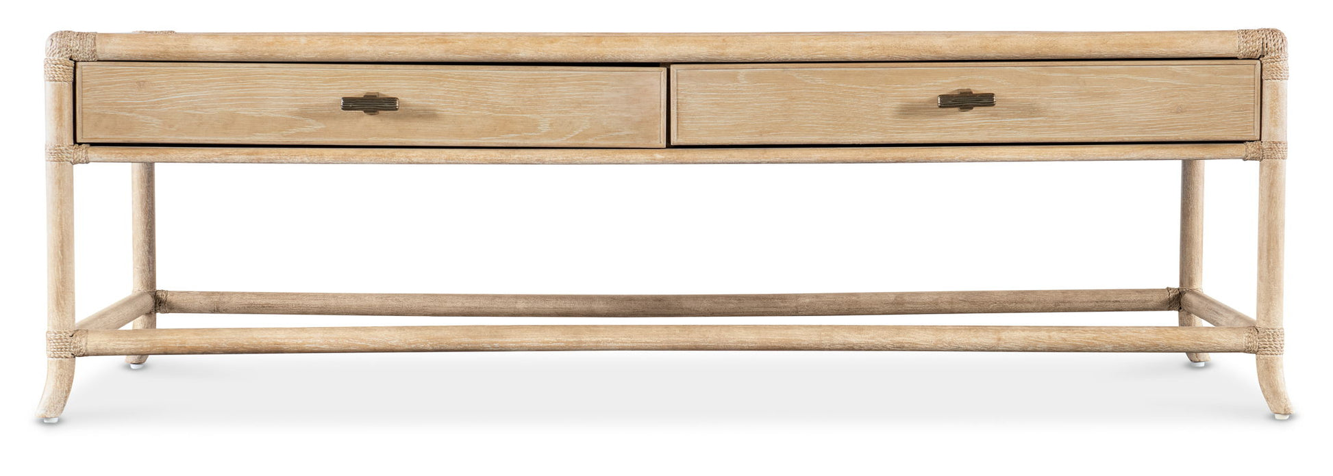 Inspired by tropical getaways, the Retreat Pole Rattan Cocktail Table is a mixture of natural materials in a laid-back, versatile design. Crafted of Oak and Maple Veneers with Rope accents at the joints, the table is finished in the sand-colored, transparent by design to showcase the unique grain patterns of the wood veneer. Finished on all sides, the table has two self-closing drawers, lower stretchers on all sides and is accented by textured, pewter-colored “T” pulls.
