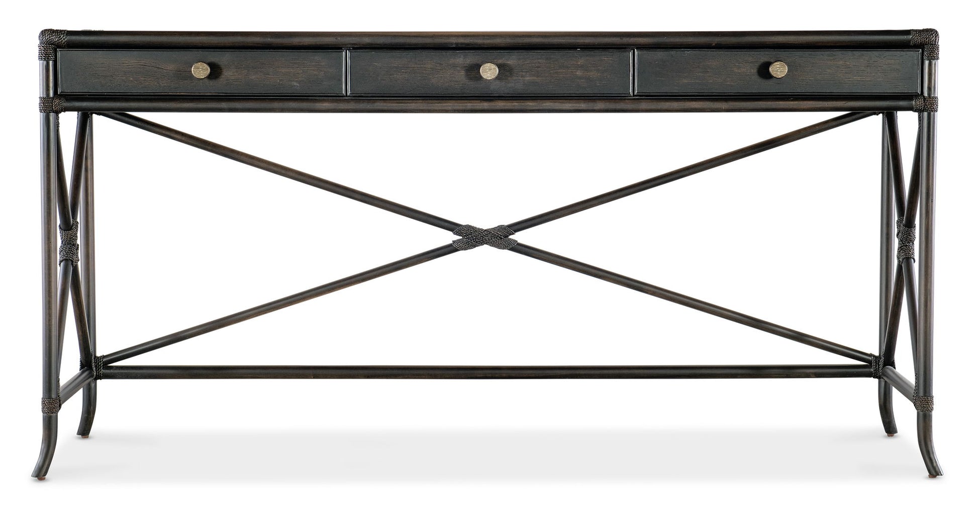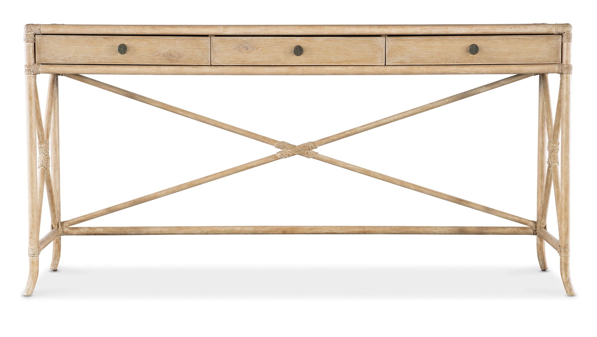 With the sublime vibe of an island oasis, the Retreat Pole Rattan Console is crafted of Oak and Maple Veneers in a Bamboo motif and accented by rope. X-design stretchers on the back and sides distinguish the piece, along with the sand-colored finish, transparent by design to showcase the unique patterns of the wood veneer. Featuring three self-closing drawers, the console is finished on all sides. Levelers included.