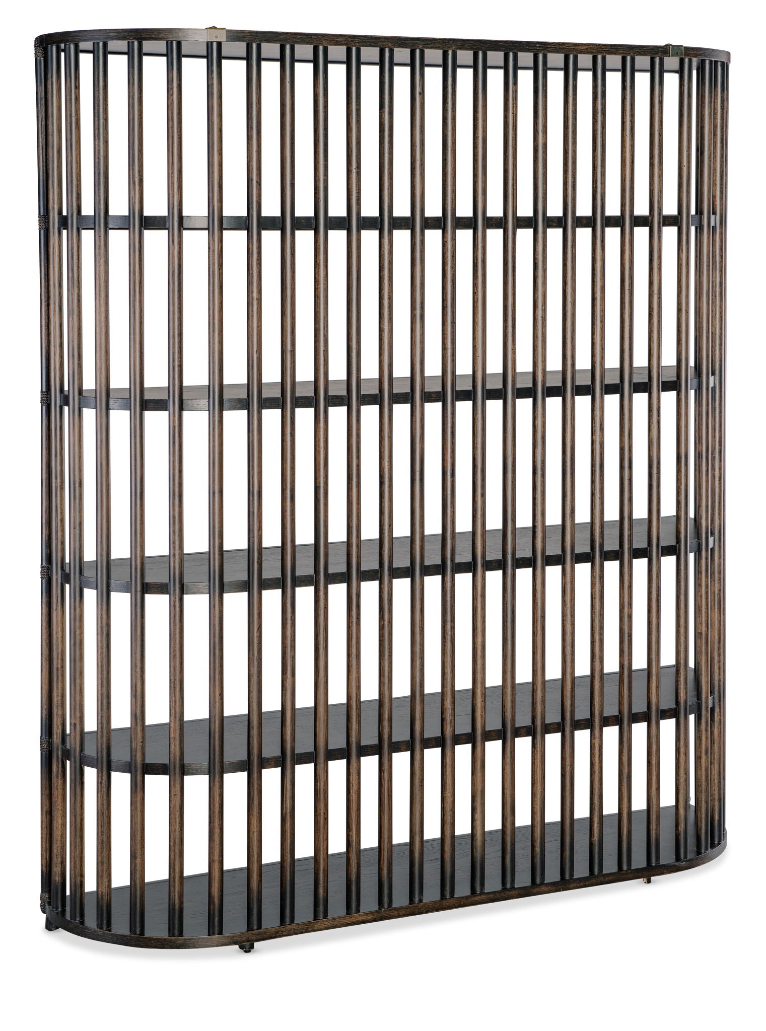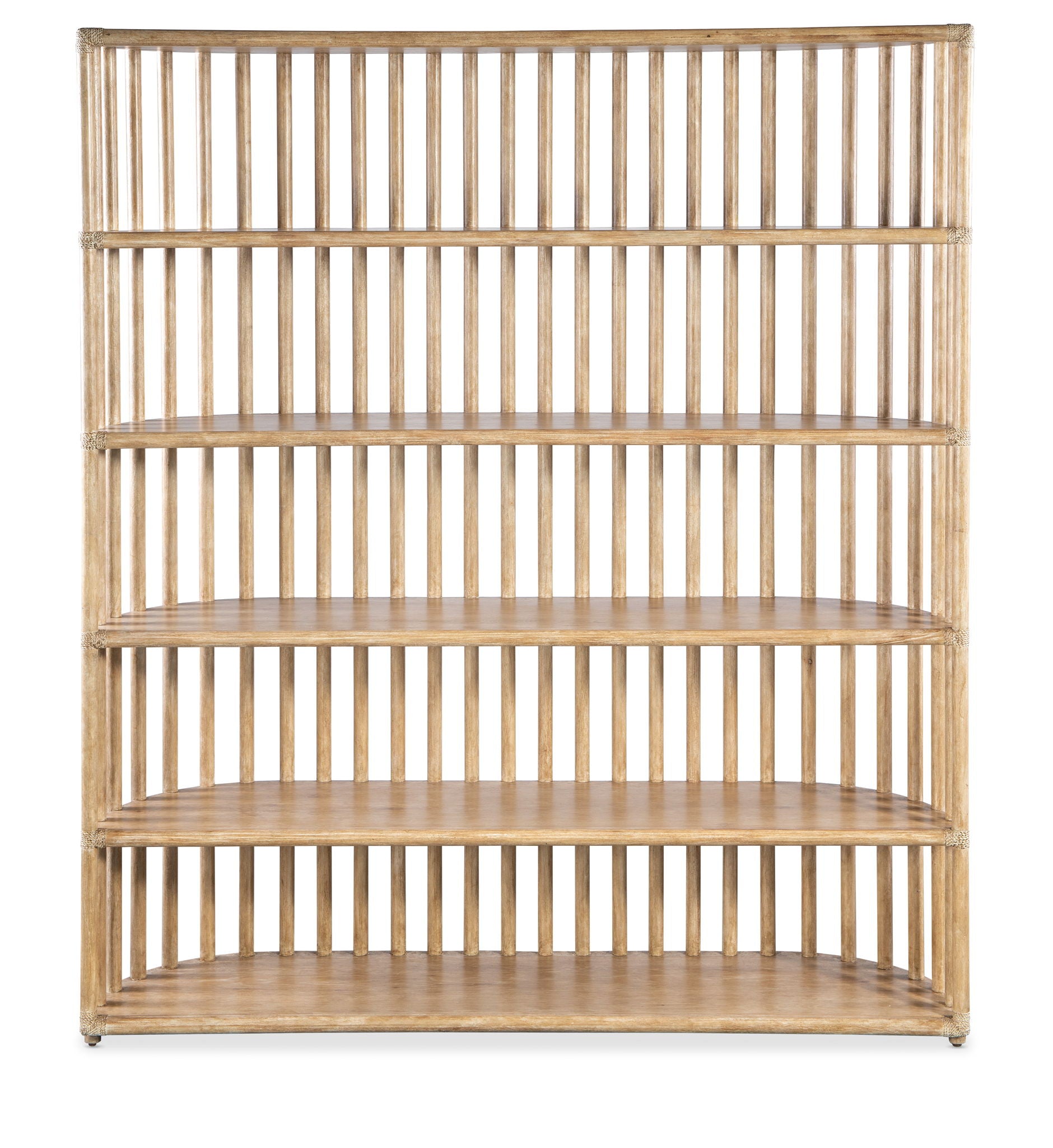 Tranquil with a modern twist and clean lines, the Retreat Slatted Bookcase defines and declutters your space. Featuring four fixed shelves, a slatted back and curved sides, it has rope accents. Finished on all sides so it can float in a room, it is crafted of Oak Veneers in the Dune sand-colored finish, transparent by design to showcase the unique wood grain patterns. The finish is inspired by light sand and the smooth shore after a receding tide.