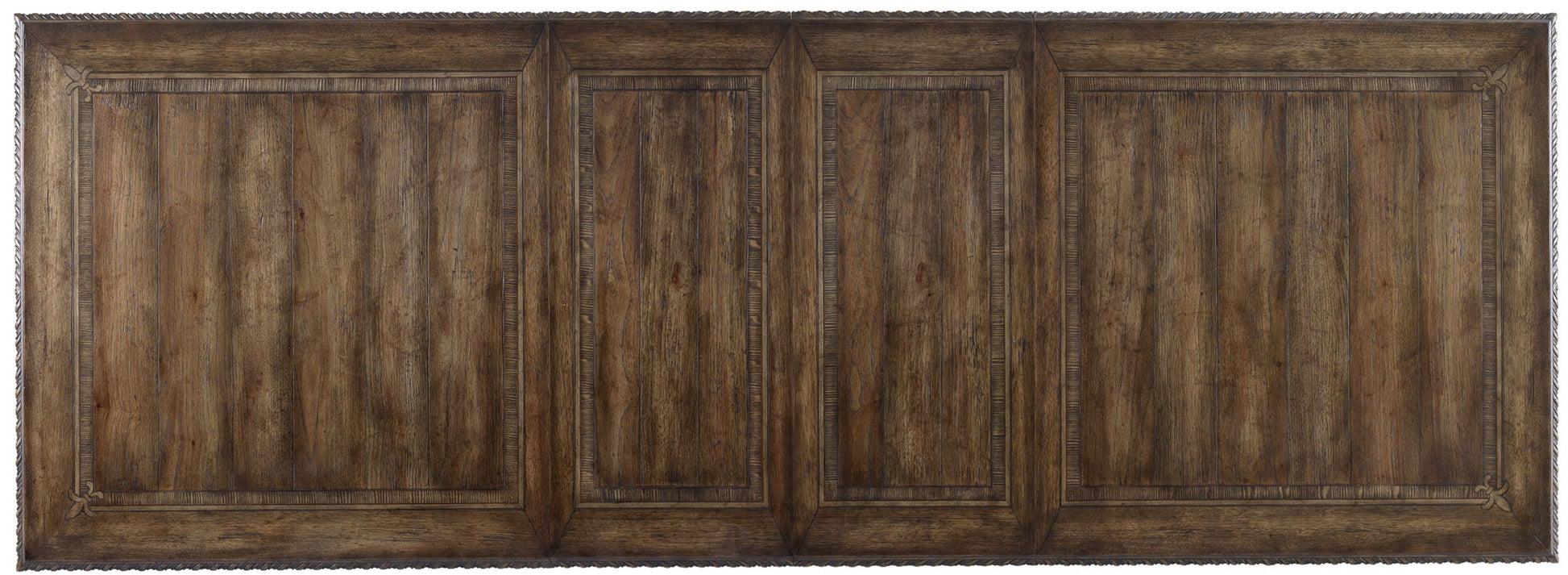 The drama of classic European design hits the heights with the grand Rhapsody Rectangle Dining Table with a scrolled trestle base. Imagine a 12th Century French chateaux that is been brought up to date without leaving a single charming detail behind. Choose to sit at the opulent yet inviting rectangular table with a carved border and scrolled bases in harp-like shapes. The walnut-colored reclaimed rustic finish projects laid-back luxury. At 88 inches long with two 20-inch leaves, this table can host a veritable banquet.