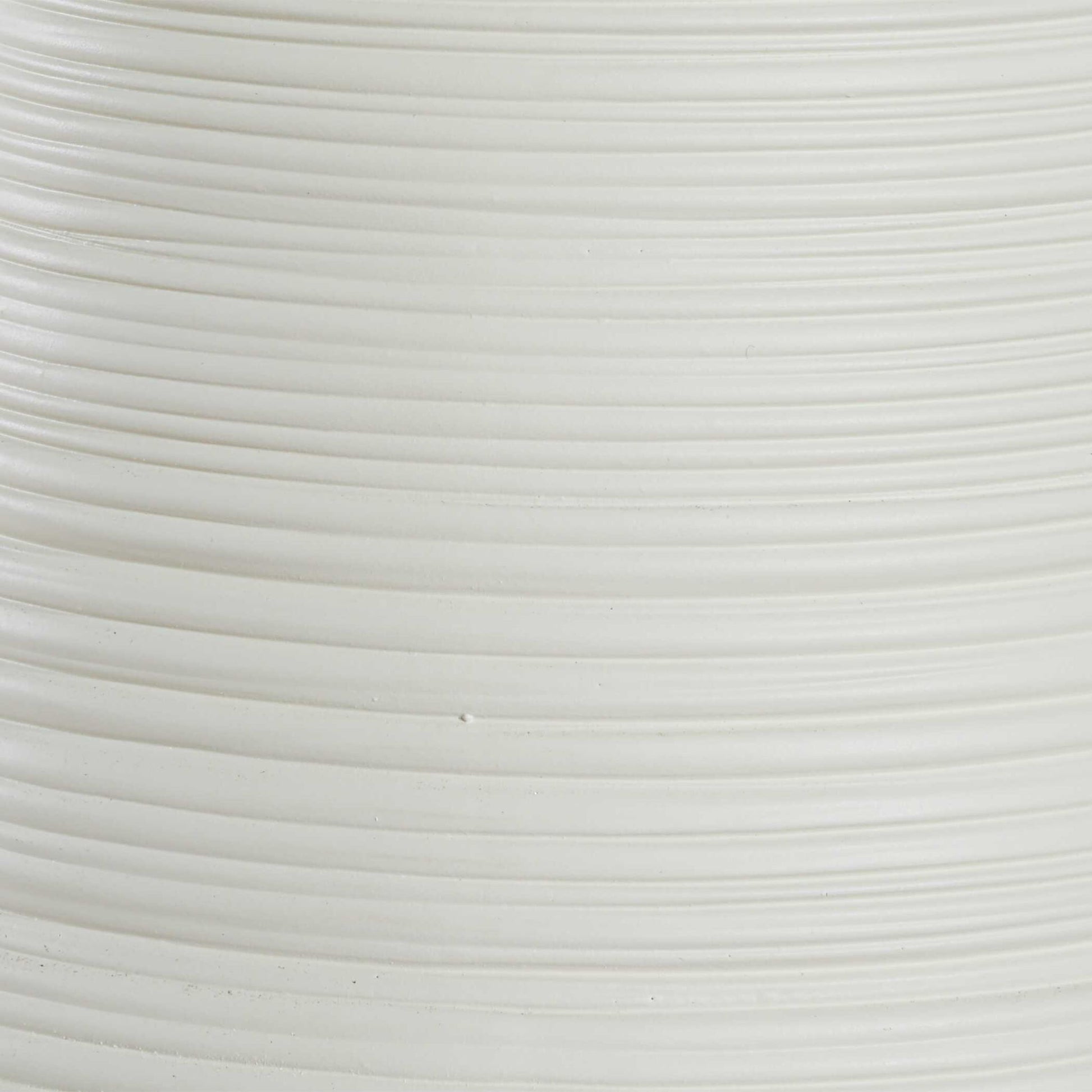 This Ceramic Table Lamp Boast A Warm White Matte Finish With Horizontal Ridge Lines, Adding A Touch Of Texture And Visual Interest To Sleek Curves, Paired With Plated Antique Brass Details. A Round Hardback Drum Shade Finished In A Casual White Linen Fabric Completes The Piece.
