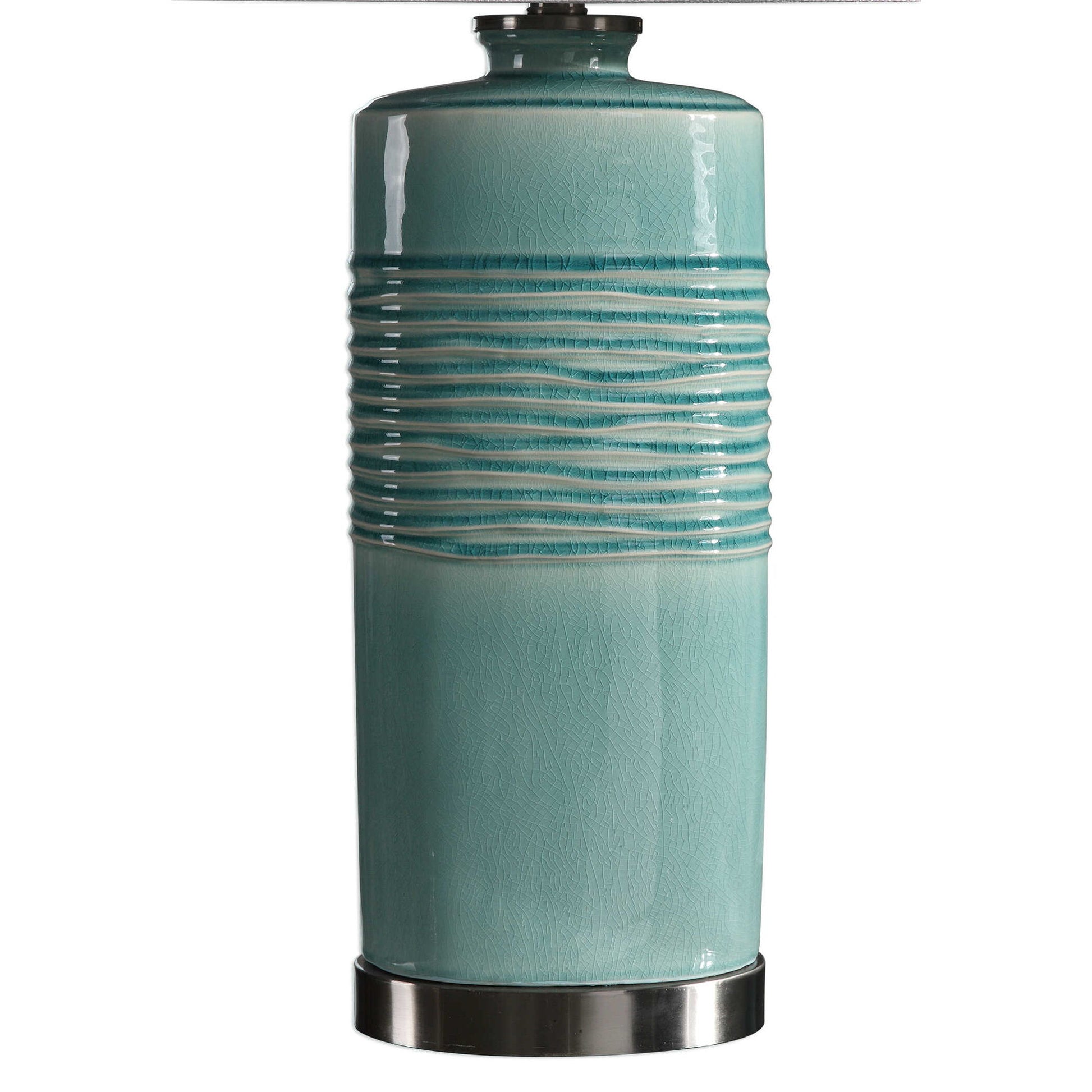The Oval Column Ceramic Base Is Finished In A Distressed Teal Glaze, Featuring A Hand Applied Imperfect Texture, Accented With Brushed Nickel Plated Details. The Oval Tapered Hardback Shade Is An Off-white Linen Fabric With Natural Slubbing. Due To The Nature Of Fired Glazes On Ceramic Lamps, Finishes Will Vary Slightly.