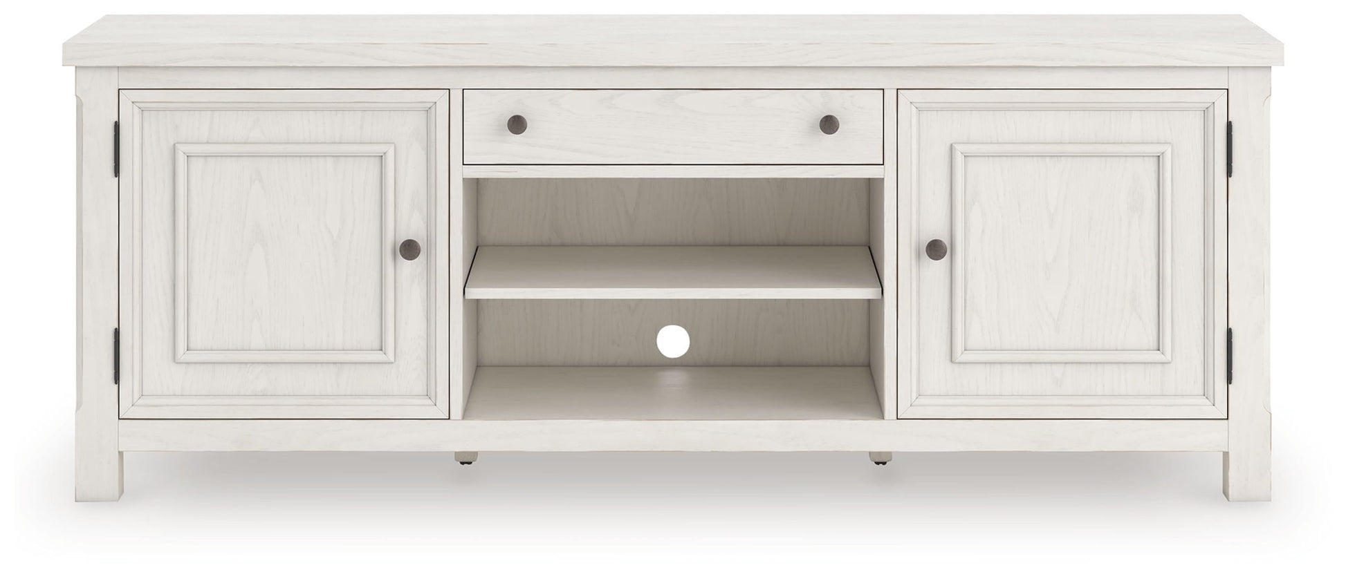This TV stand is sure to impress when it’s time to relax after a tough day. With an antiqued white finish and wood grain texture, modern farmhouse-style design has never been so fashionable. Its cabinets and adjustable shelves are ideal for keeping all your equipment well organized and displaying your treasures. And that storage drawer is perfect for smaller accessories, bringing even more function to your entertainment space. All that’s missing is you.