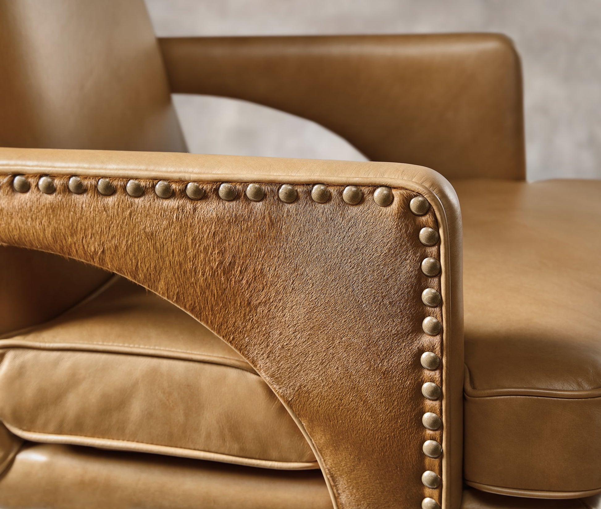 The Rochelle Executive Swivel Tilt Chair showcases a unique Modern Mountain Rustic style. Upholstered in dark blonde two-tone aniline leather and wrapped in coordinating hair-on-hide, this chair offers a distinctive aesthetic. The medium nailhead trim and warm wood cap base with antique gold casters add a rustic yet luxurious touch to your home office.