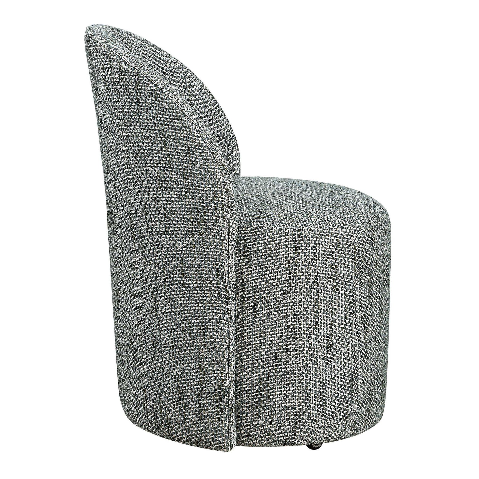 Inspired From Classic Vanity Seating But Proportioned For Dining, The Roll With It Chair Features Rolling Casters For Ease Of Use. Its Smooth Lines Are Fully Upholstered In A Textural Woven Chenille In Rich Emerald, White And Teal Tones.