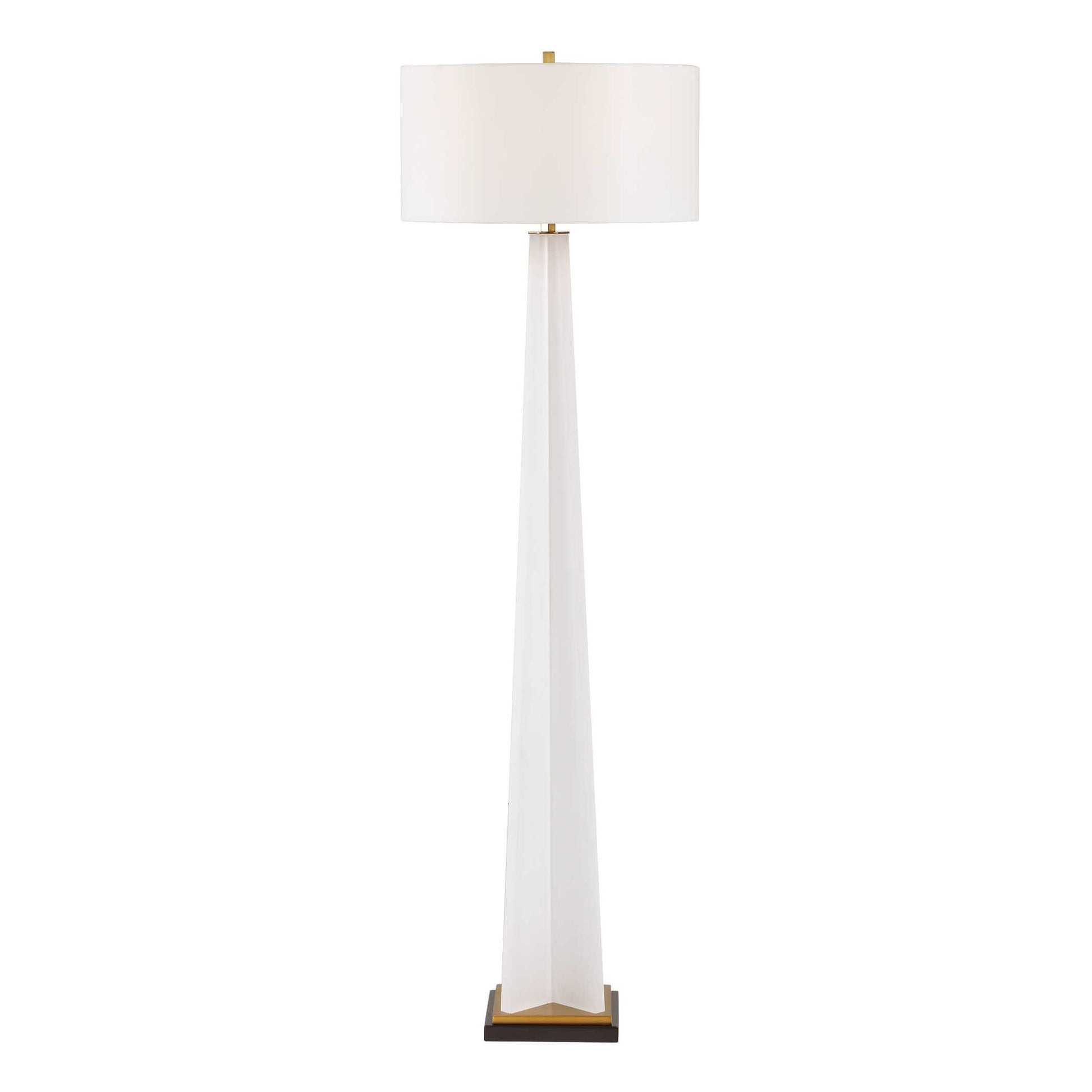 This Striking Contemporary Floor Lamp Features A Sleek, Tapering Form Crafted From Frosted White Acrylic. The Modern Design Is Elegantly Grounded By A Sophisticated Iron Foot, Finished In Both Antique Brass And Black, And Is Complemented By Matching Antique Brass Hardware For A Refined Touch. The Round Hardback Drum Shade Is A Crisp White Linen Fabric.