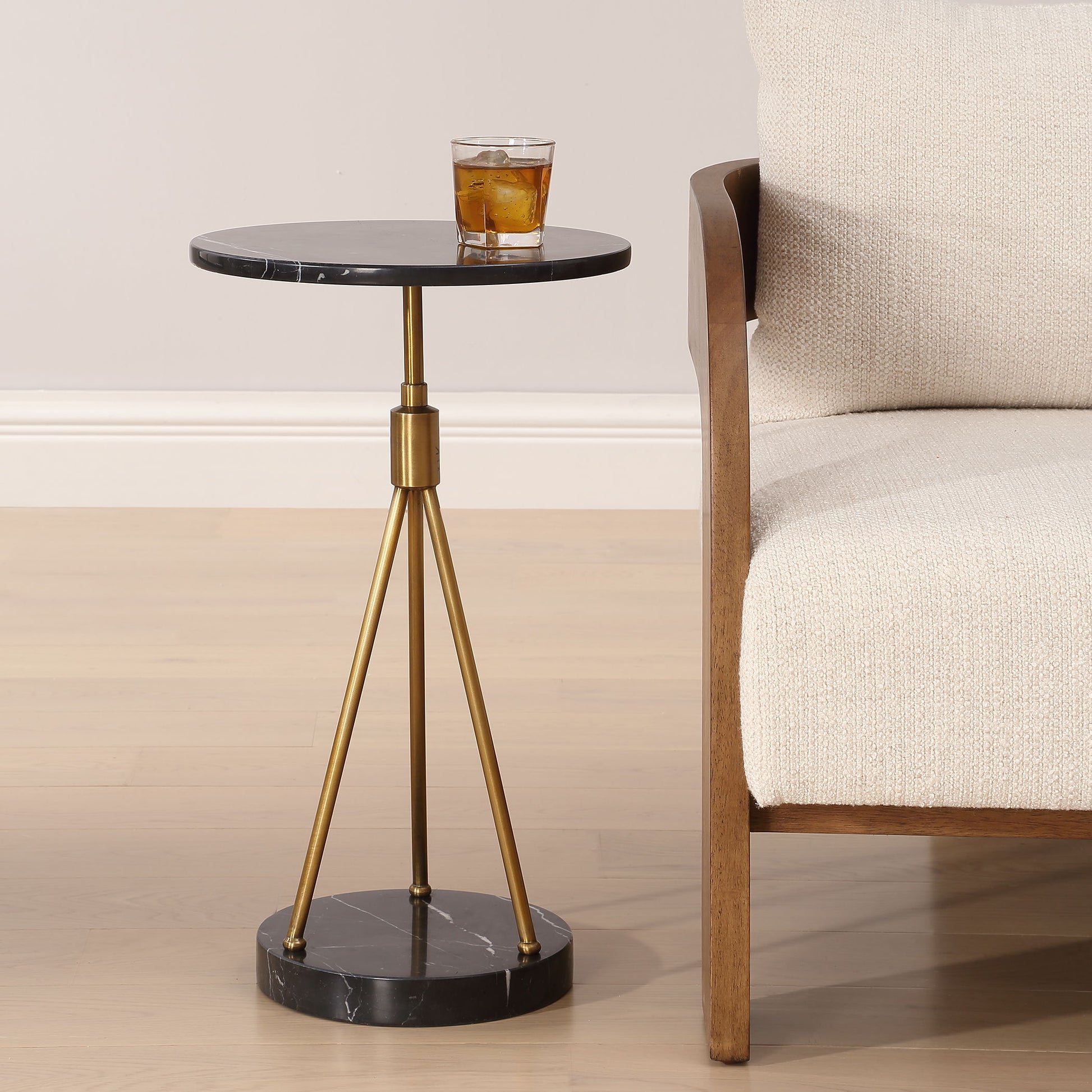 This Stylish Accent Table Seamlessly Fuses Luxurious Materials With A Sophisticated Design. This Table Is Crafted By Fusing A Black Marble Base And Top With Stunning White Veining With An Intricate Tripod Brass Finished Body. Due To The Nature Of Marble, Each Piece Will Have A Unique Coloration And Veining Pattern.