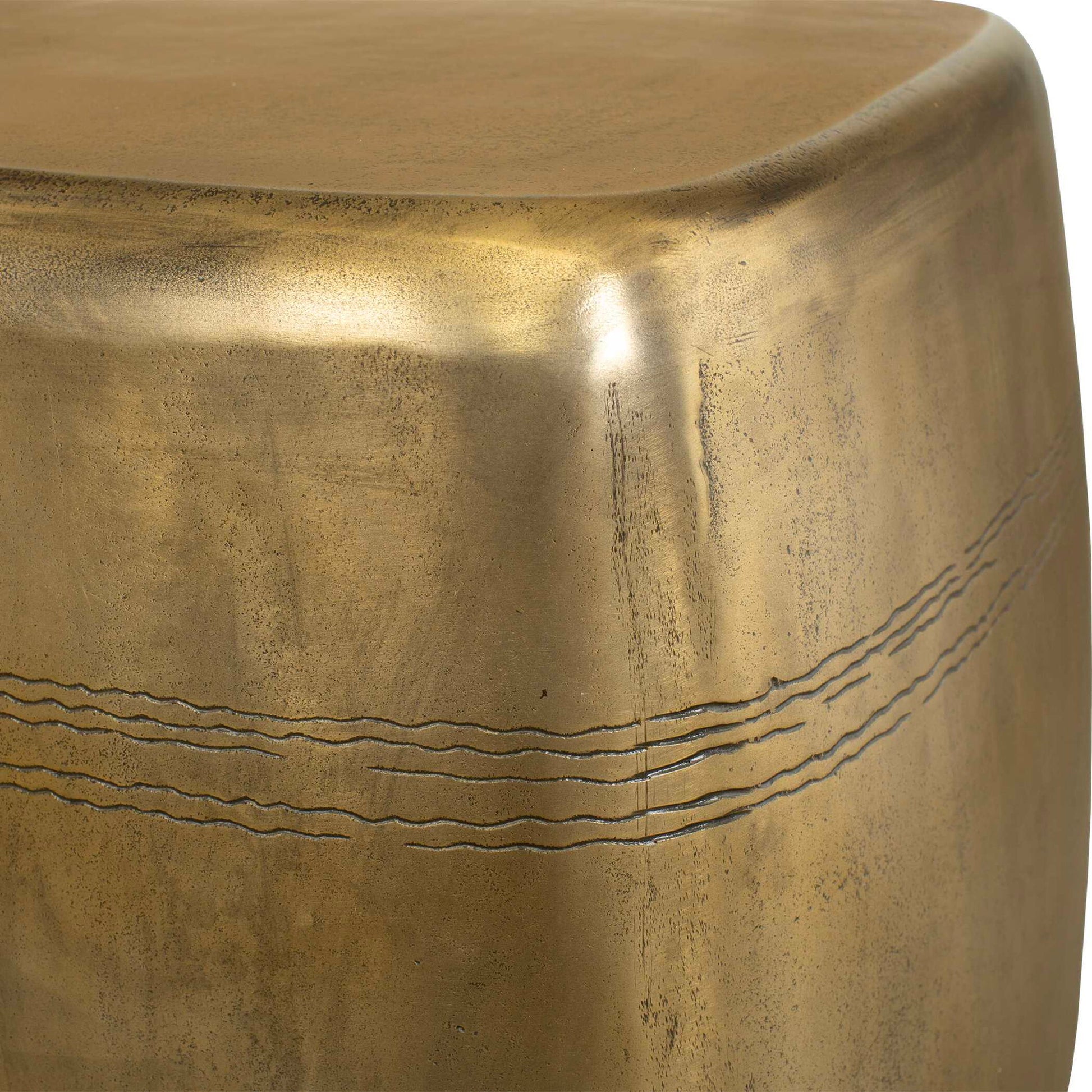 This Captivating Table, Casted Entirely From Aluminum, Showcases A Textured Aged Brass Finish With Subtle Banding Engraved Across The Sides. Suitable For Both Indoor And Outdoor Use.