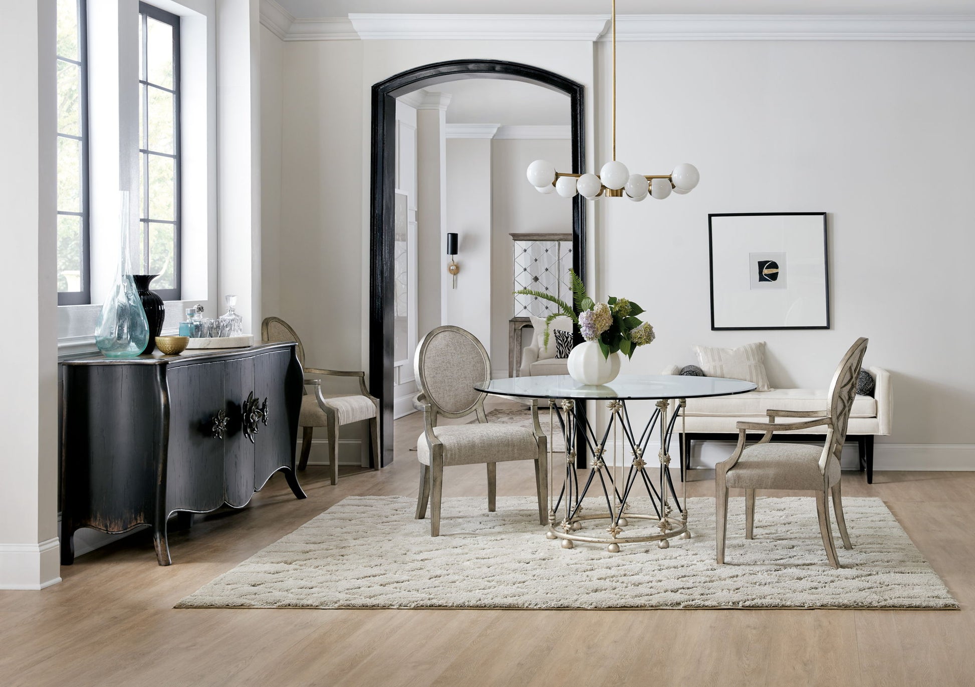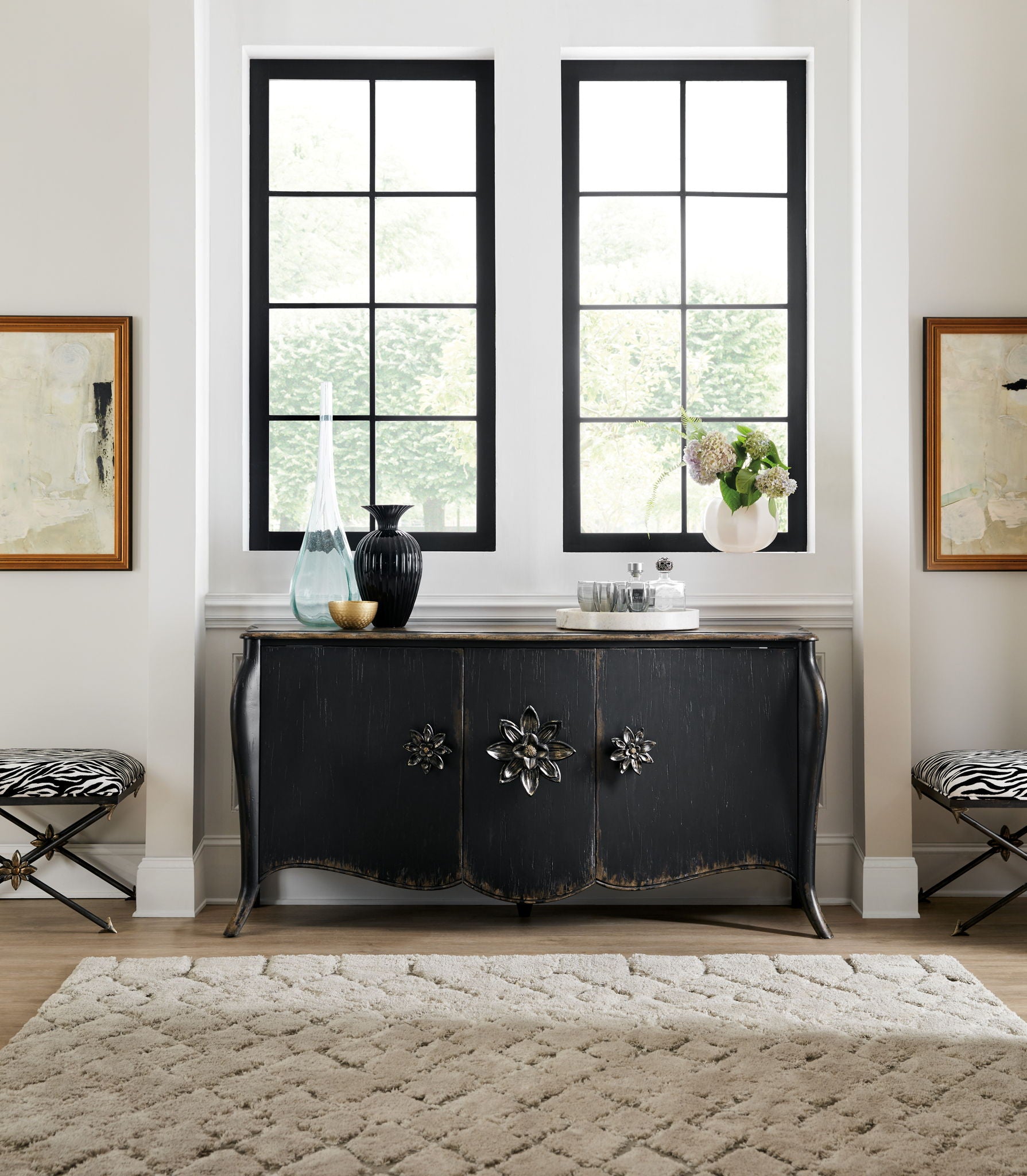 Absolutely captivating, the Bien Ame Buffet is a luxurious piece that is approachable and inviting. With classic bones, the 3-door buffet features a shaped apron and cabriole legs and delightful decorative floral hardware. Crafted of Poplar and Hardwood Solids with Oak Veneers, it is finished in Porte Noir, a black paint with rich brown undertones with areas of heavy rub through and distressing to reveal a honey tone wood color. Doors have soft-close hinges, and there is one adjustable shelf behind each door.