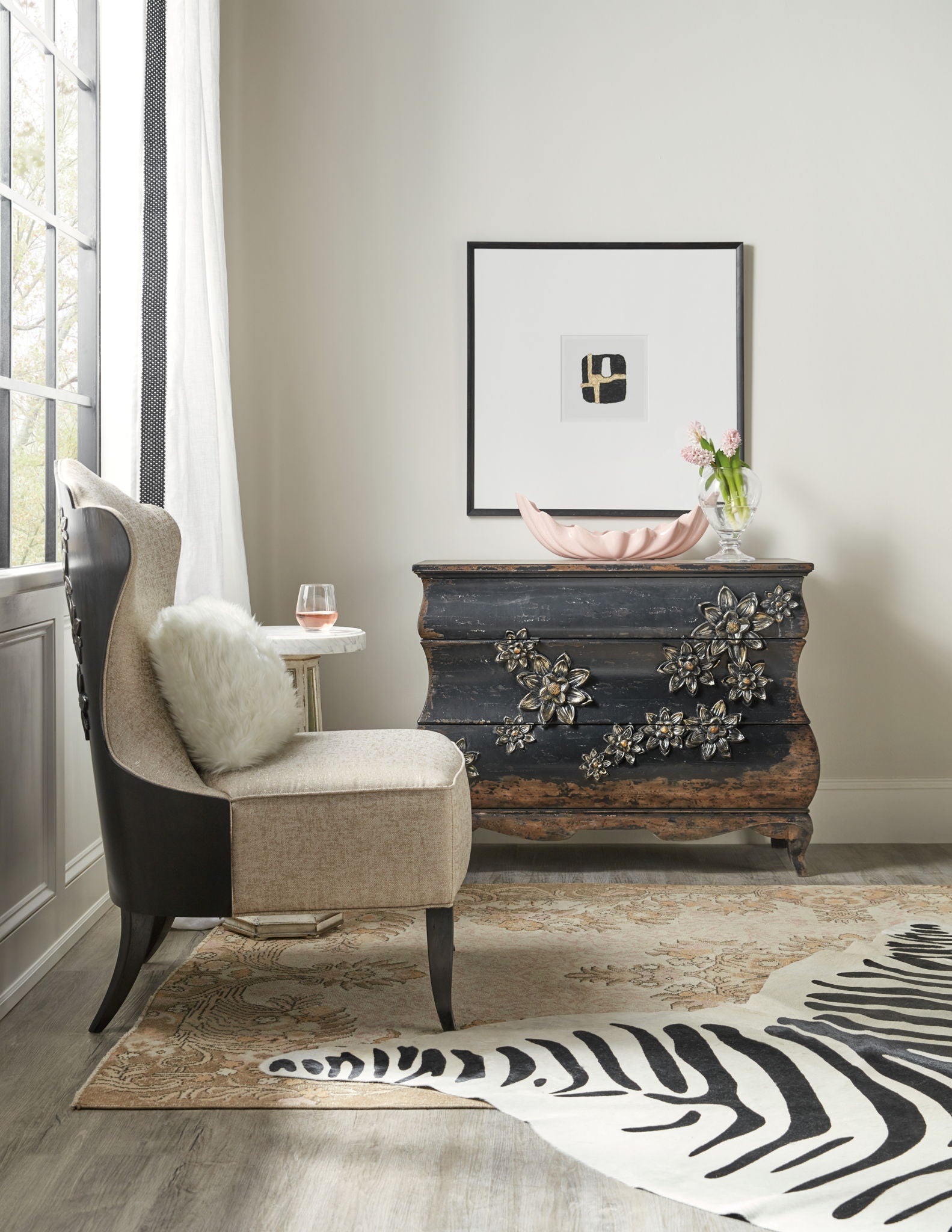 With the look of a cherished heirloom that is been passed down for generations, the Charmant Bachelorette Chest exudes an enchanting feeling that will add magic to your home. The random floral design that graces the front is carved for a dimensional feel. The Porte Noir finish is a black paint with rich brown undertones, rubbed to a medium sheen with areas of heavy rub through and distressing to reveal a honey tone wood color. Three drawers. The top drawer is lined in black and white designer wallpaper. Functional as well as pretty, the piece includes a power supply, and a light underneath with 3-intensity touch switch.