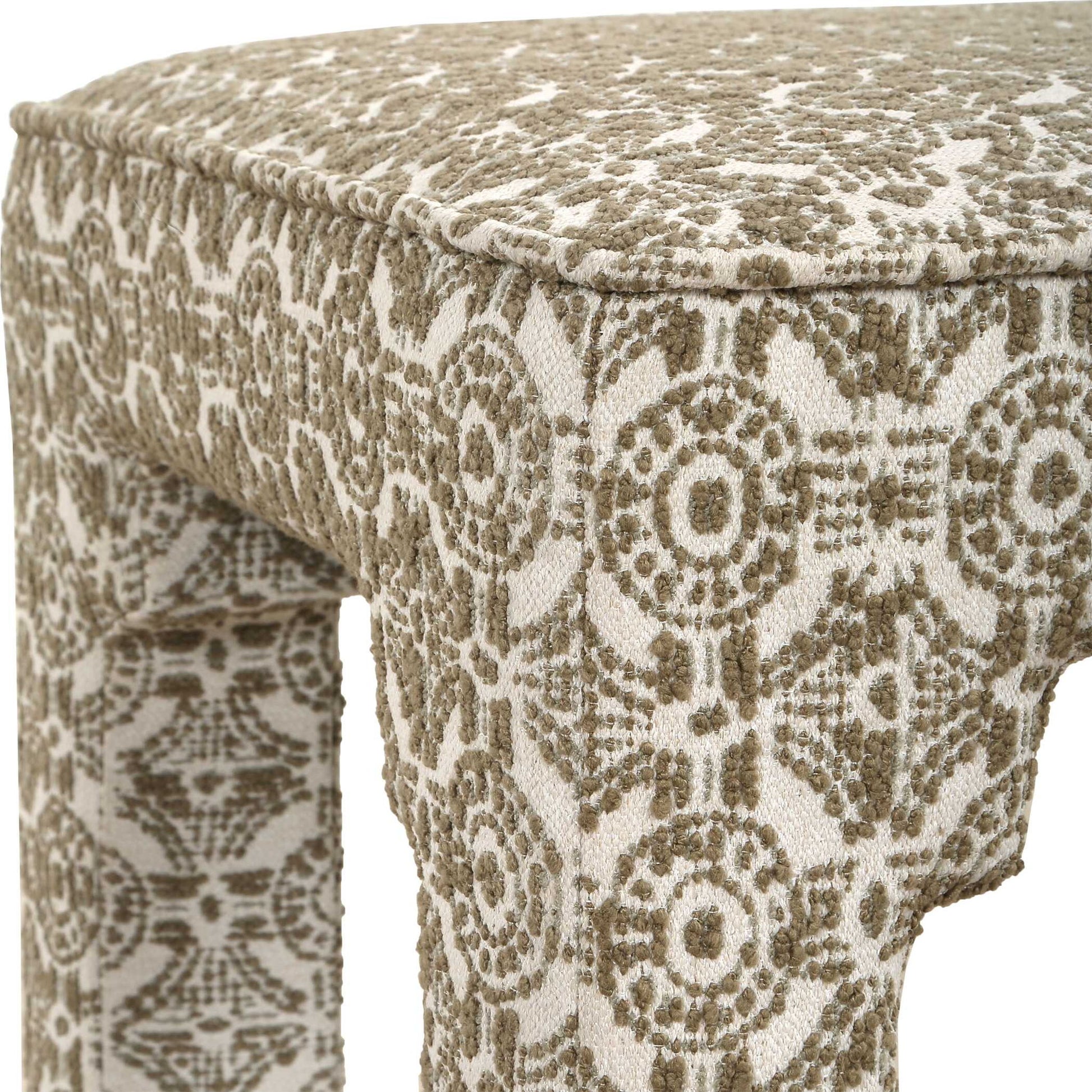 Compact Yet Impactful, The Satoria Small Bench Offers A Touch Of Refined Style. Upholstered In A Rich, Textural Boucle Featuring An Olive Green Medallion Lattice Motif.