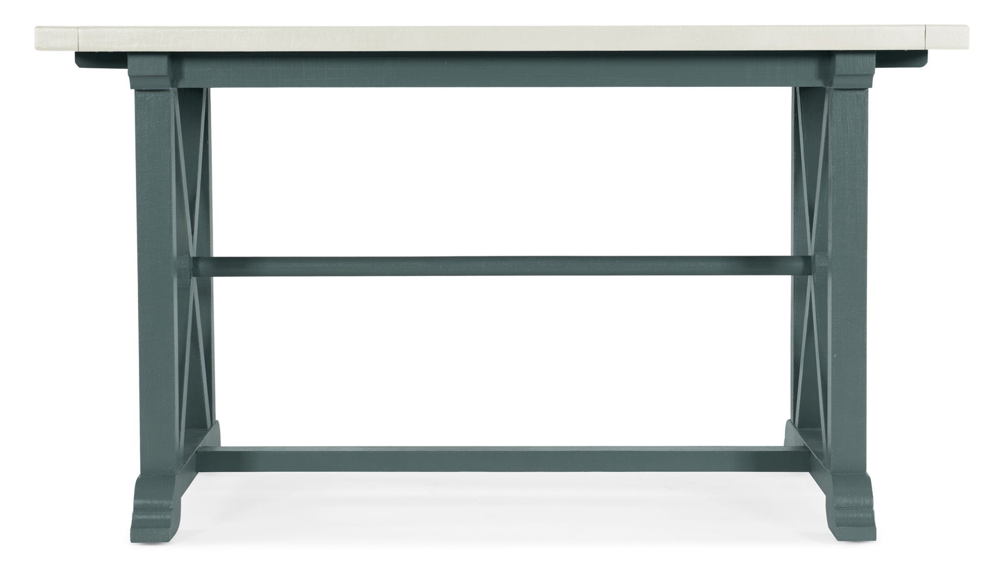 Capture the calming palettes and organic textures of cottage waterfront living with the chic classic counter height Piers Friendship Table. Crafted of Oak Veneers with a Solid-Wood Edge top, the table has an x-motif base and stretcher. If the two 12-inch leaves are used, the table extends to 88 inches long and accommodates 6 counter stools. Without the leaves, it accommodates 4 counter stools.