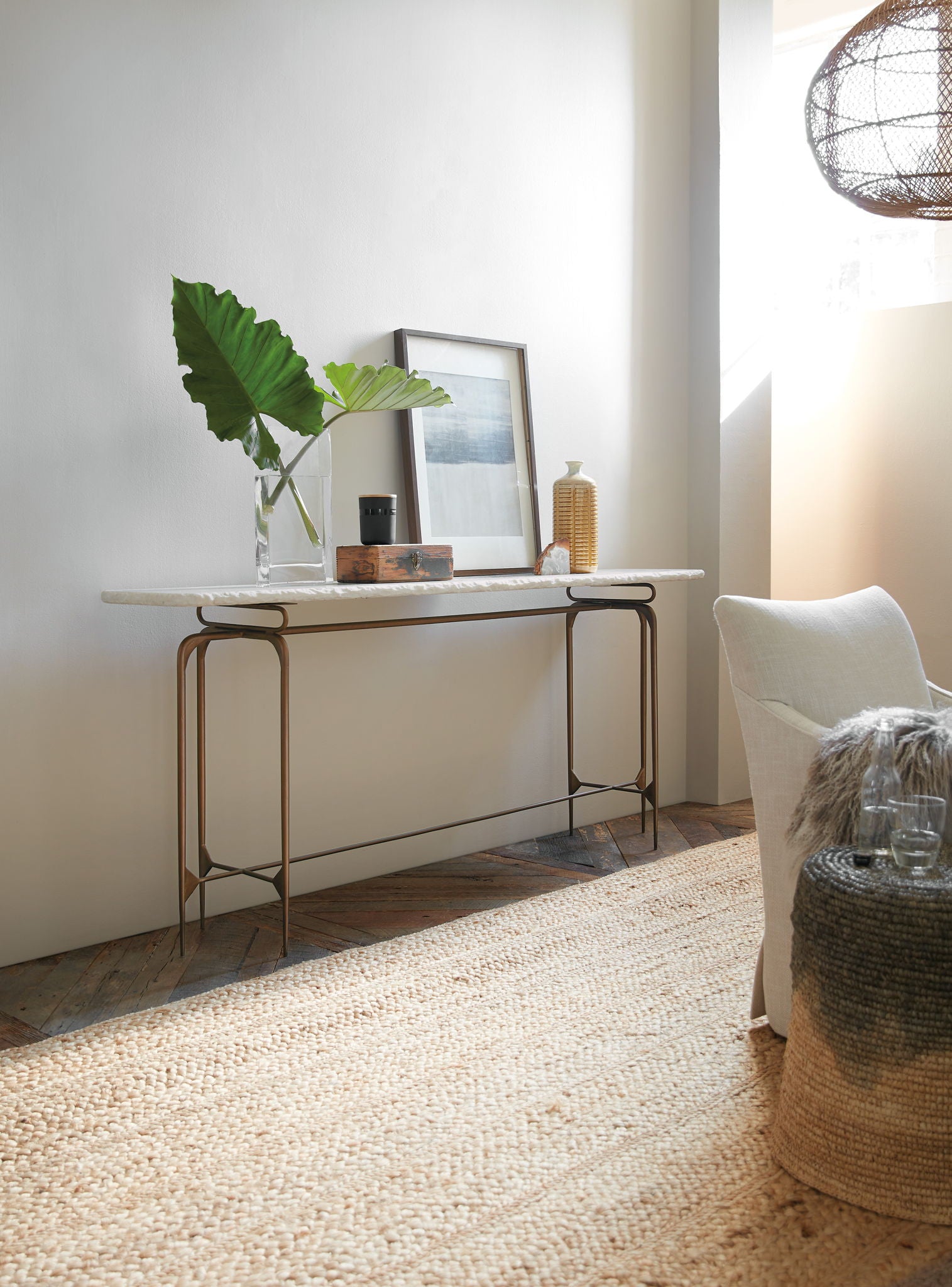 Inspired by nature’s landscapes and crafted of organic materials, the Skinny Metal Console combines an antique copper-colored iron base with a marble top. Finished on all sides, the console adds the authenticity of the outdoors to any space.