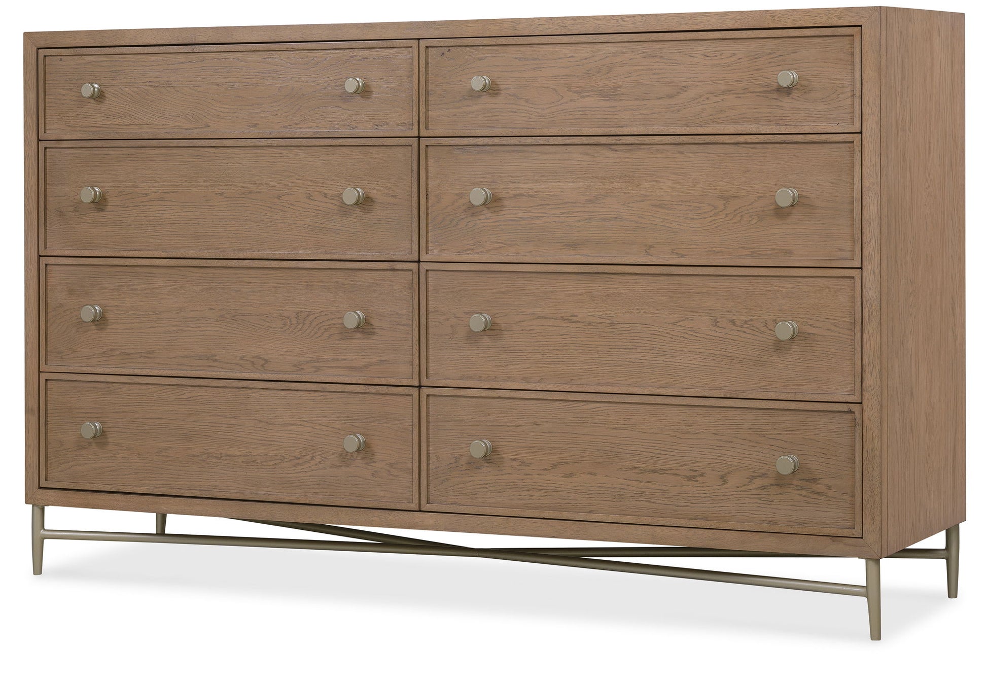 A stylistically versatile dresser blending natural textures with a light-and-airy modern aesthetic, the Sonnet 8-Drawer Dresser is crafted of Quartered and Cathedral-Cut White Oak Veneers in a light earthen-toned finish. Chic satin-finished metal knobs accentuate the metal frame and the slender, tapered legs and X-stretcher. All drawers are self-closing, and the right top drawer has cream-colored removable felt-lined jewelry tray and a removable felt liner. The bottom two drawers are cedar-lined.