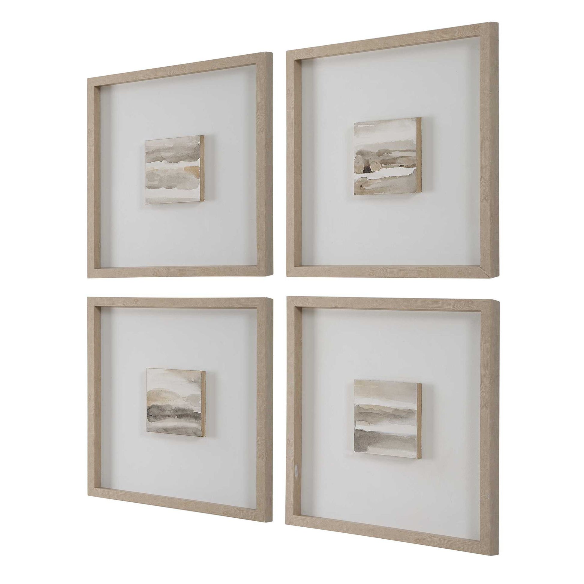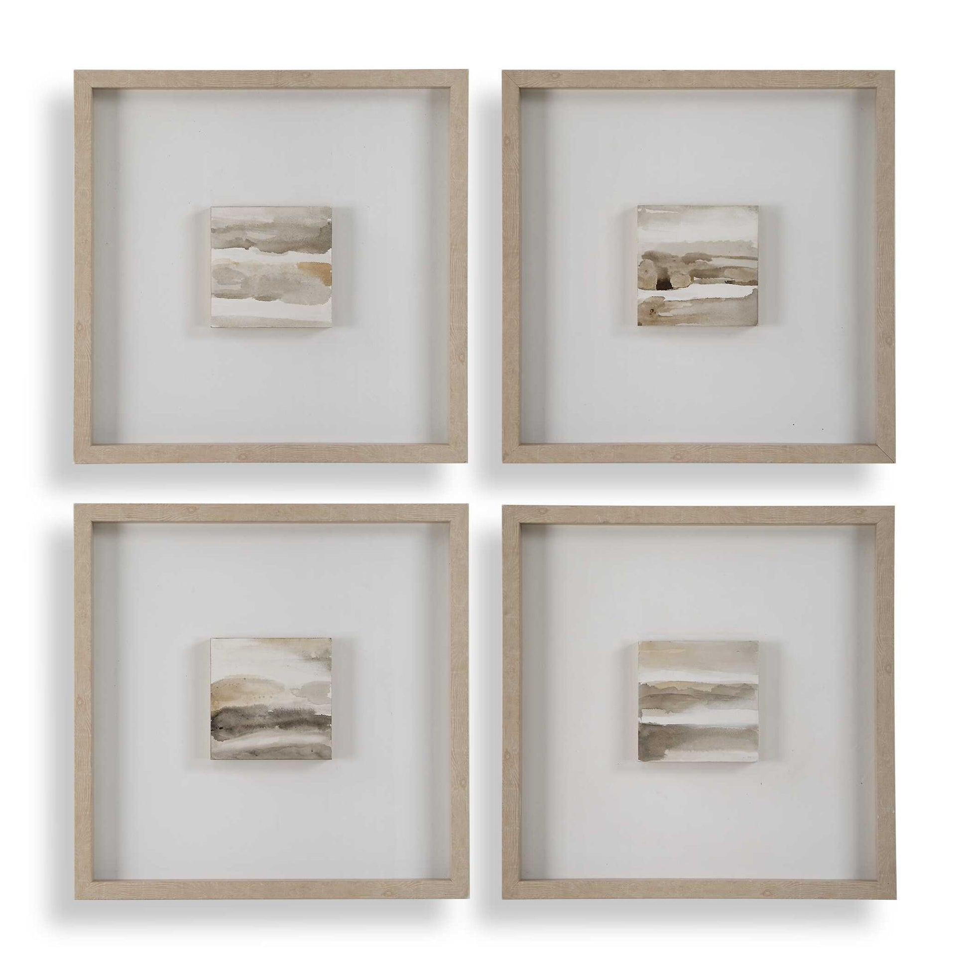 This Striking Set Of Four Features Abstract Landscapes In A Soothing Palette Of Earthy Beige, Gray, And Brown. Each Piece Is Painted On A Petite Wooden Board And Mounted On A Clean White Canvas, Enased In A Naturally Finished Wooden Frame, A Design Choice That Beautifully Enhances The Art With Depth And A Modern Aesthetic. Due To The Handcrafted Nature Of This Artwork, Each Piece May Have Subtle Differences. May Be Hung Horizontal Or Vertical.