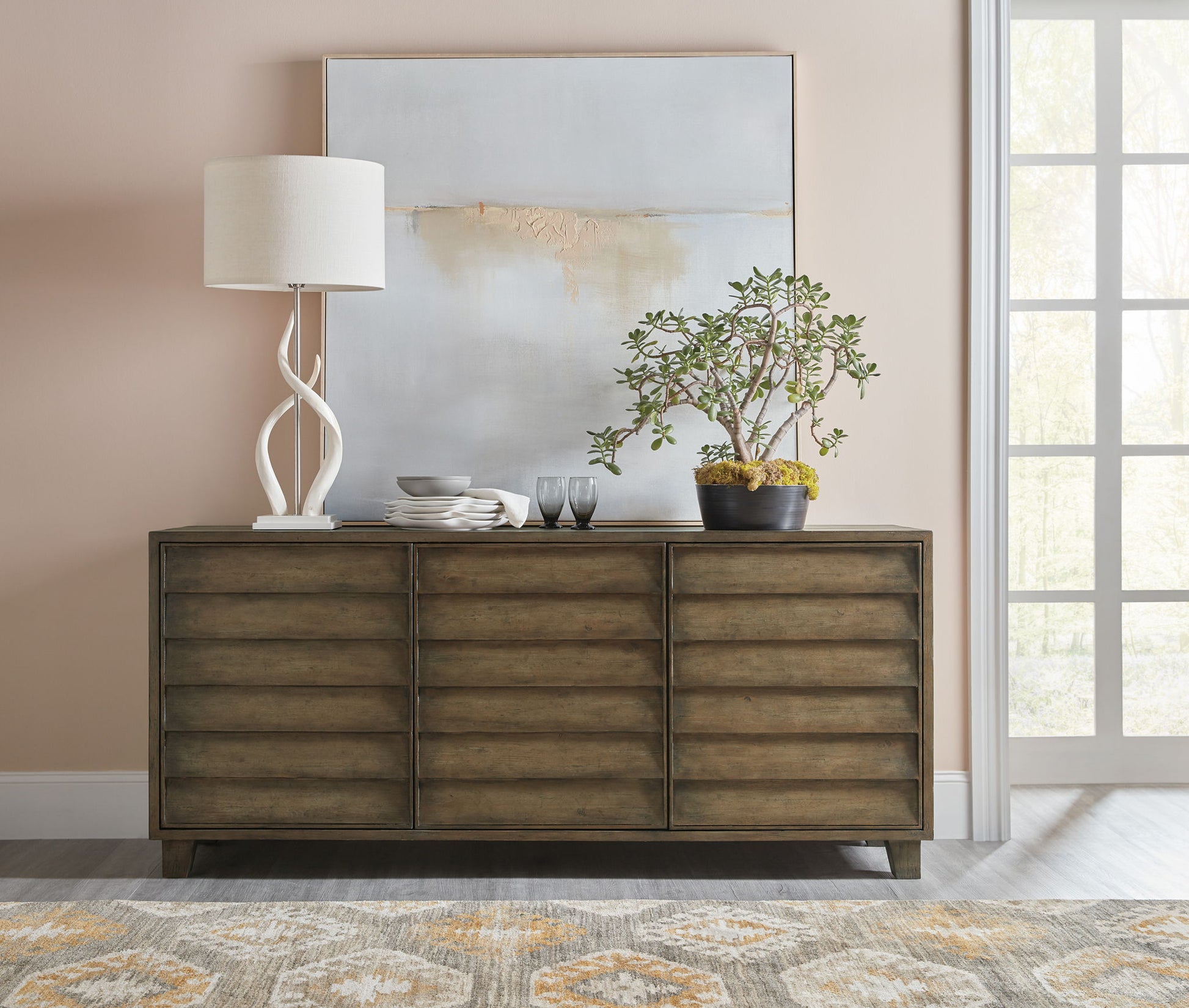 With a modern mountain aesthetic, the Sundance Buffet strikes a serene profile with resort-inspired shutter-like door fronts. The buffet features 3 doors with magnetic catches and soft-close hinges and two self-closing drawers behind a left pair of doors. The left drawer has a removable drop-in felt liner, and the right drawer has a removable felt silverware tray. There’s one adjustable shelf behind the left pair of doors and two adjustable shelves behind the right door. Crafted of Quartered Pine and Maple Veneers with a Solid-Wood edge top and finished in the rich brown Cliffside.