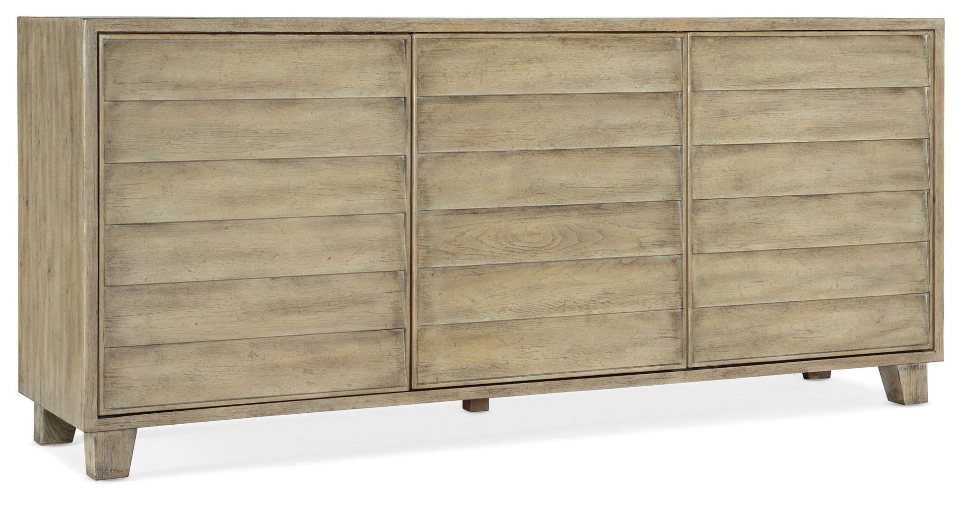 Epitomizing the lifestyle of a casual, beach-town community, the Surfrider Buffet strikes a serene profile with resort-inspired shutter-like door fronts. The buffet features 3 doors with magnetic catches and soft-close hinges and two self-closing drawers behind a left pair of doors. The left drawer has a removable drop-in felt liner, and the right drawer has a removable felt silverware tray. There’s one adjustable shelf behind the left pair of doors and two adjustable shelves behind the right door. Crafted of Quartered Pine and Maple Veneers with a Solid-Wood edge top and finished in the light natural Driftwood finish.
