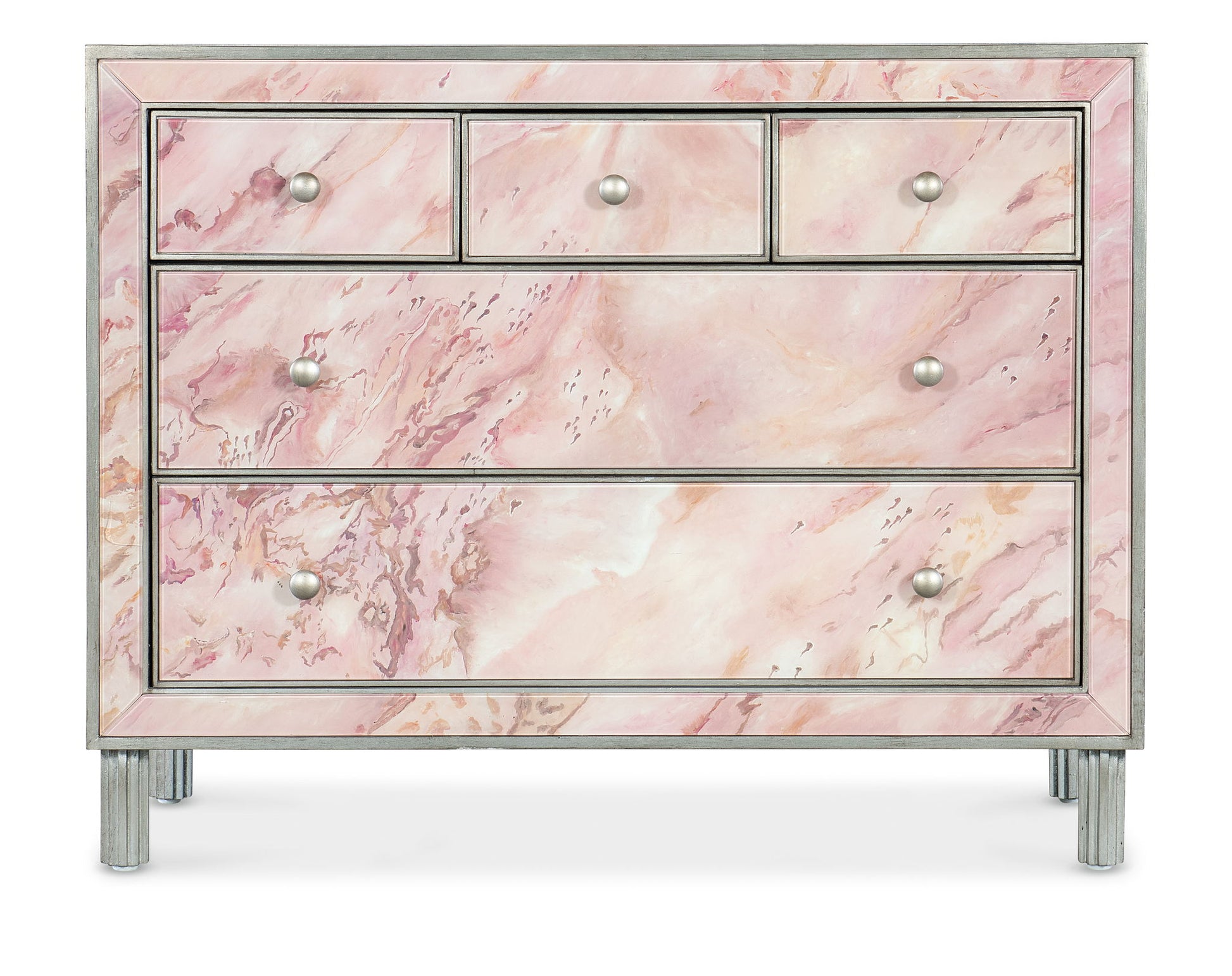 A tribute to the incredible strength and fortitude of those affected by breast cancer, the Eternal Chest features reverse painted class and watercolor-like pink hues complemented by silver accents, ribbed silver legs and silver-finished round metal knobs. The five self-closing drawers have pink interiors.