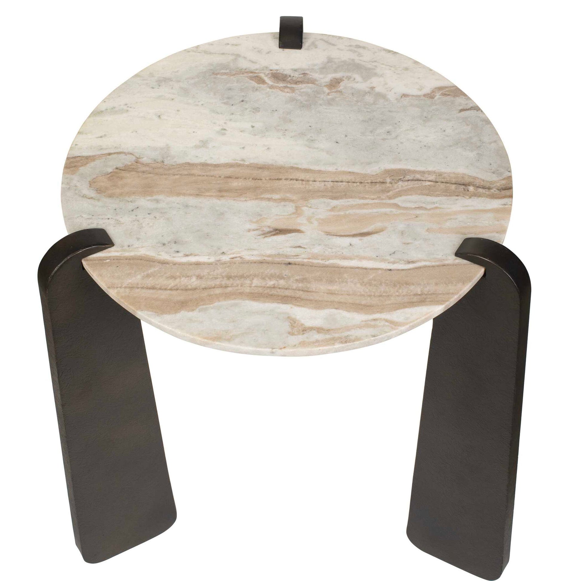 This Exquisite Side Table Features A Refined Marble Tabletop, Showcasing Beautiful Veining In White, Gray, Sand And Brown Tones. It Rests Upon Substantial Legs Crafted From Textured Iron, Finished In A Rich, Aged Dark Bronze. True To The Nature Of Natural Materials, Each Piece Will Have Unique Marbling And Veining Throughout.