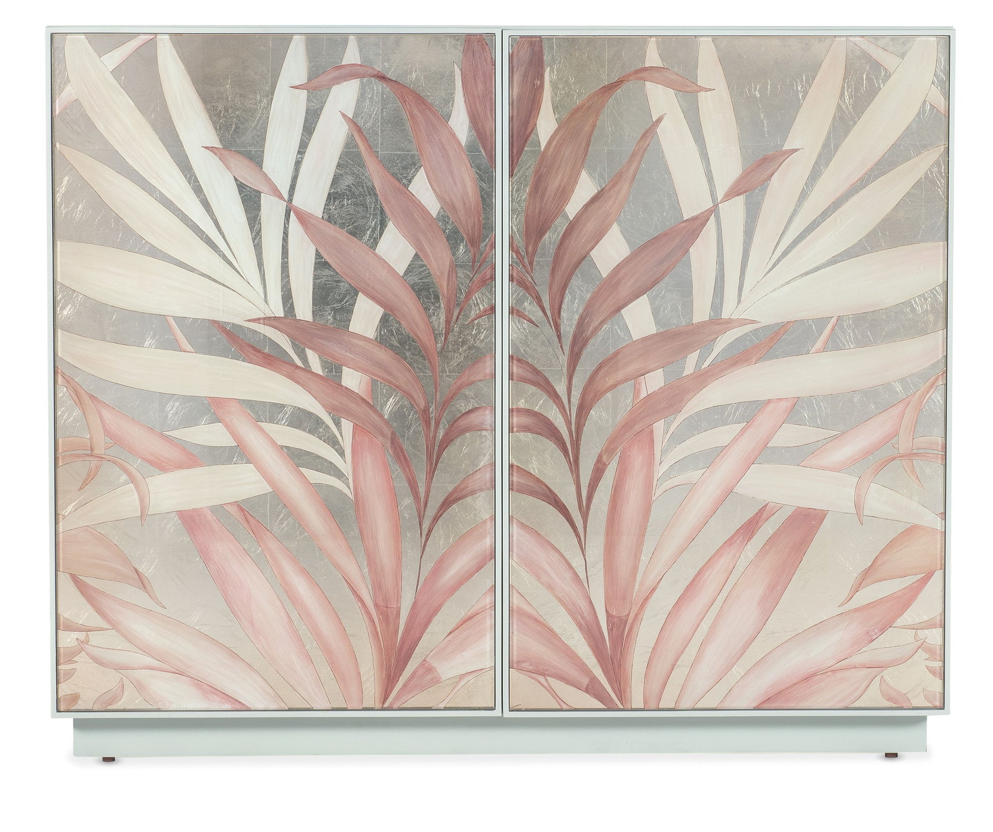 Combining the best elements of tropical and beachy style, the Triumph Accent Chest is crafted of Maple Veneers with a mint green exterior and gold-leafed door fronts with hand painted palms in pink, white, gold and silver hues. The two doors have touch latches, and there’s one adjustable shelf behind.