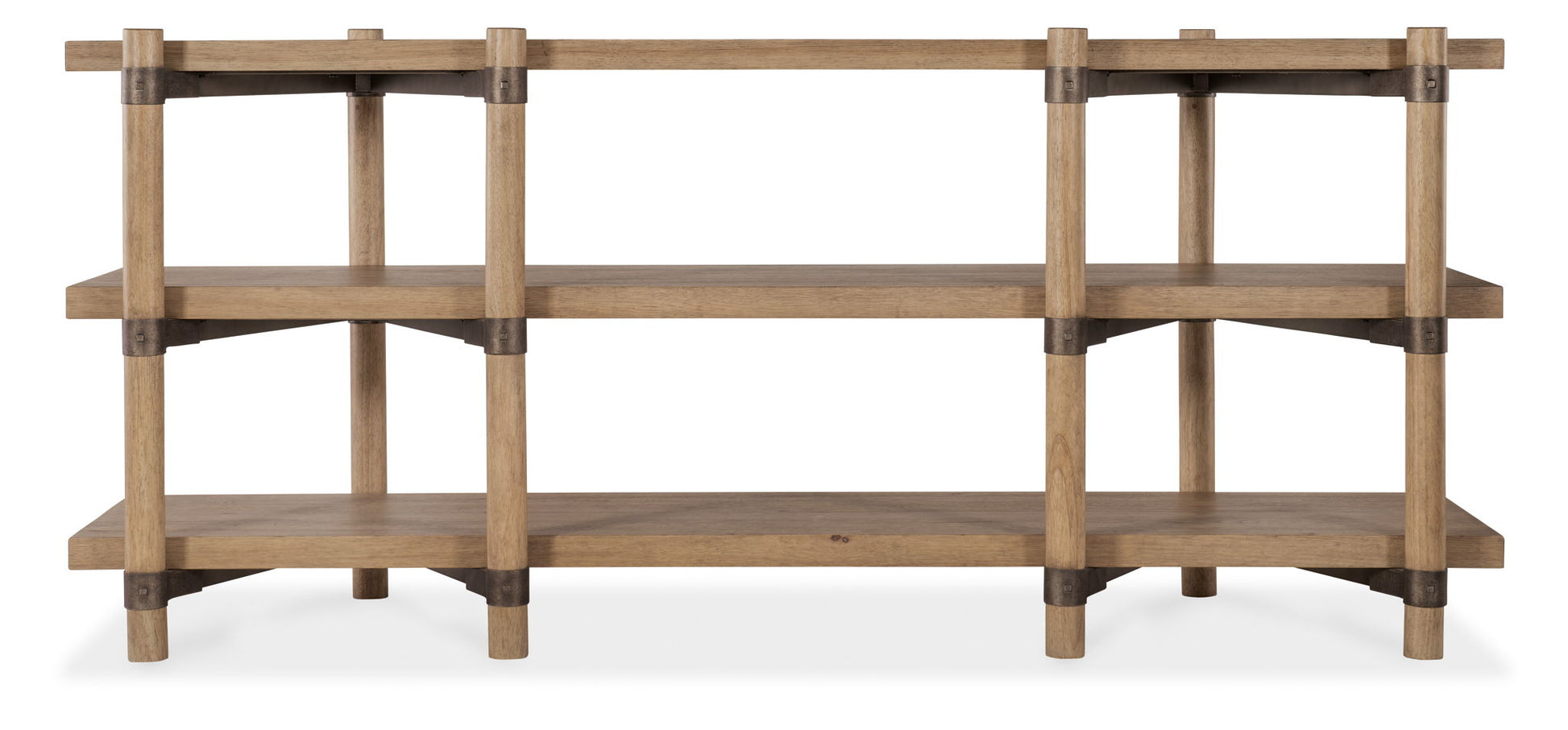 Inspired by the casual wine country lifestyle and the craftsman architecture of the Napa Valley, the Vineyard Row Console is crafted of Pecky Hickory Veneers with rustic hammered metal bracket accents and finished in the light-and-airy Sonoma. Featuring two fixed shelves, it can be used from either side and accommodates up to an 80-inch TV.